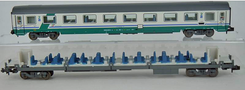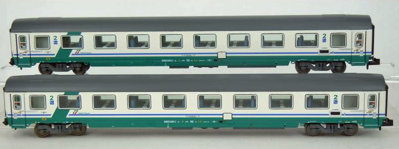 Gran Confort Wagenset der FS für die Epoche 5. Die Wagen tragen die XMPR-Lackierung mit dem XMPR logo rosso. Das Set besteht aus einem Großraumwagen und einem Abteilwagen.