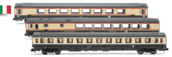 3-teiliges Reisezugwagen-Set IC "Benedetto Core" der FS in Bandiera Lackierung mit Logo Inclinato, für die Epoche 4.