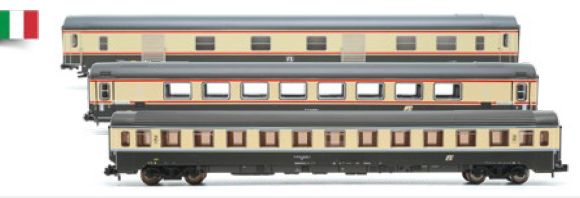 3-teiliges Reisezugwagen-Set IC "Benedetto Core" der FS in Bandiera Lackierung mit Logo Inclinato, für die Epoche 4.