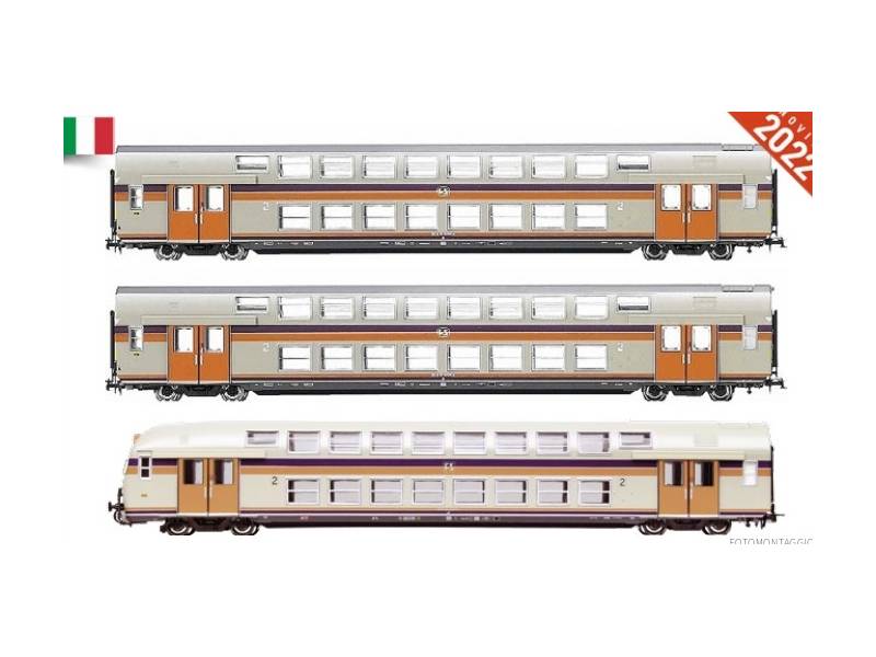 3-teiliges Doppelstockwagen-Set des Typs Casaralta der FS, MDVC Lackierung mit TV-Logo, bestehend aus einem Steuerwagen und zwei 2.Klasse Wagen, für die Epoche 4.