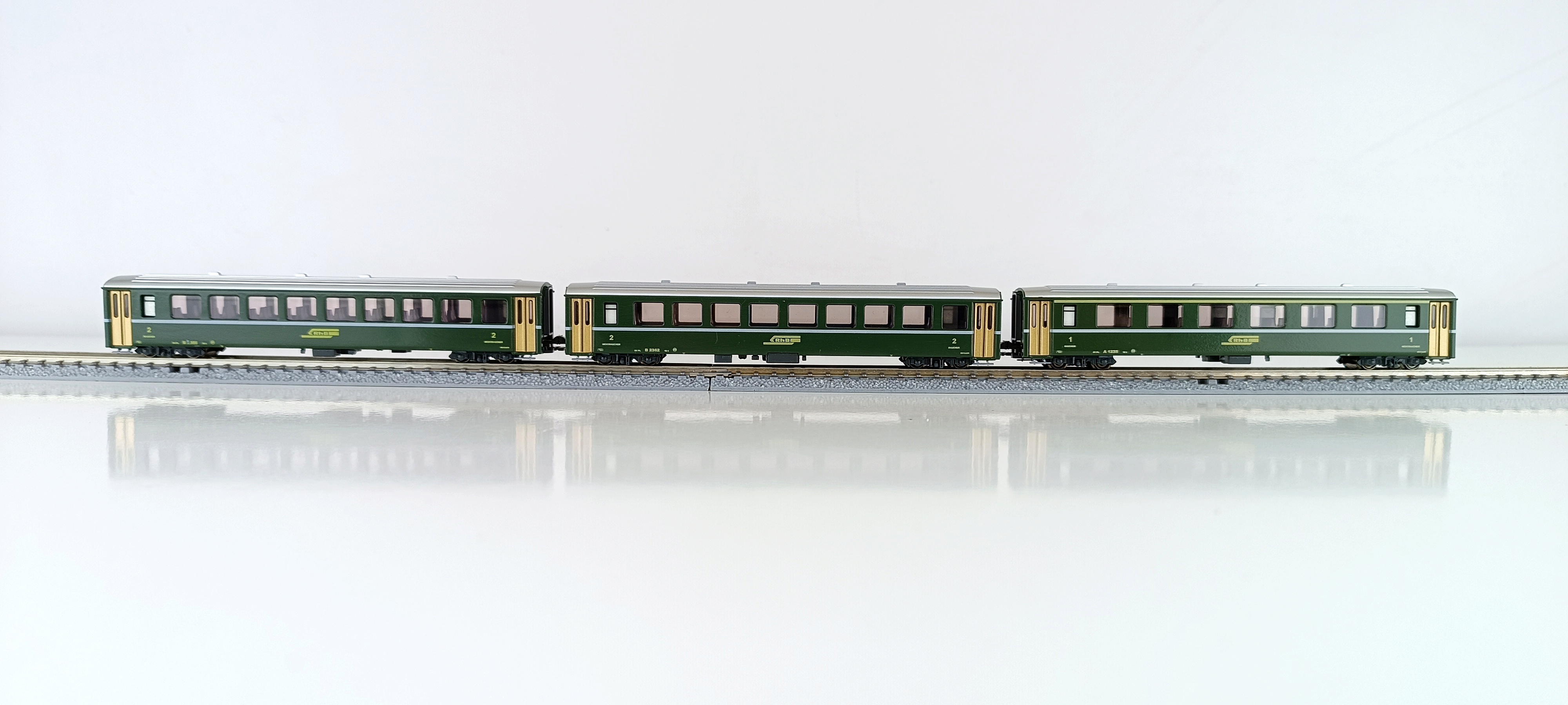 3er Set Personenwagen der Bauart EW I in grüner Farbgebung der RhB für die Epoche 4/5.