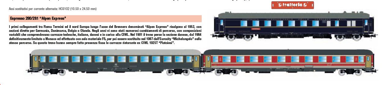 FS, 3-unit pack of coaches ?Alpen-Express?, including 1 restaurant coach CIWL WR 1925T, 1 x 1st class coach UIC-X in red/grey livery and 1 x 2nd class coach UIC-X in grey livery, ep. IV-V
