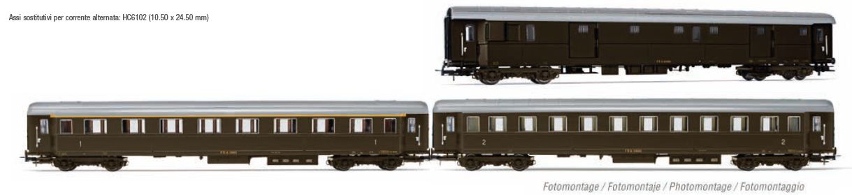 FS, set de 3 coches, compuesto de un furgón Dz 83000, un coche de primera clase Az 13010 Tipo 1946 y uno de segunda clase Bz 33010 Tipo 1946, decoración ?castaño?, ép. III