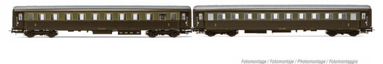 FS, set de 2 coches, compuesto de un coche de segunda clase Bz 33010 Tipo 1946 con cabina ?ristoro? y uno de segunda clase Bz 33010, decoración ?castaño/Isabella?, ép. III