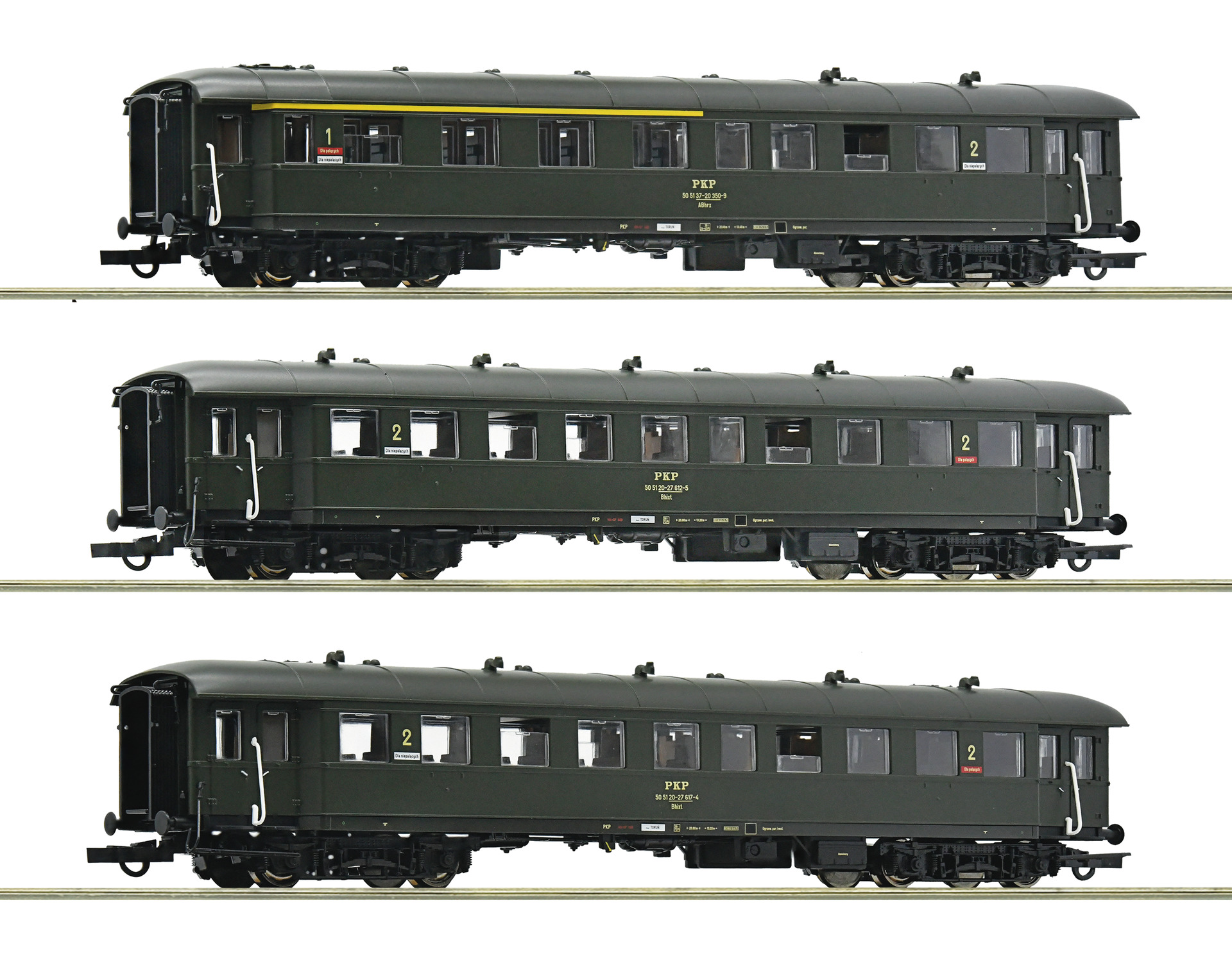Wagenset mit drei 4-achsigen Personenwagen (ex DRG) der Polnischen Staatsbahnen. Das Set besteht aus einem Personenwagen 1./2. Klasse, Gattung ABhrx, einem Personenwagen 2. Klasse, Gattung Bhixt, und einem Personenwagen 2./3. Klasse, Gattung Bhixt (ex C4i-30). - Betriebszustand 1972 - Passend zu Dampflok Ty2, Art.-Nr. 70107, 70108, 78108
