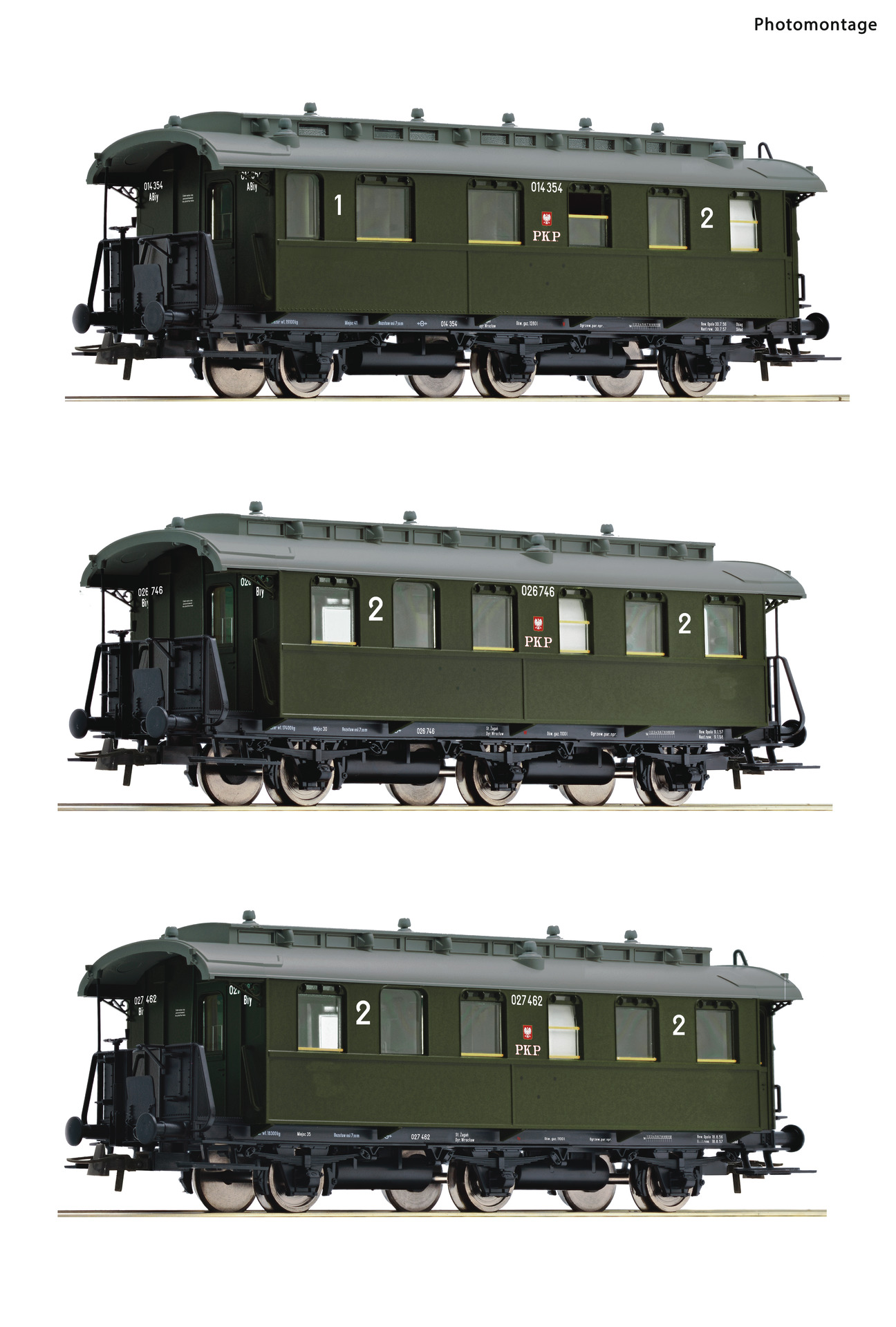 Wagenset mit drei Personenwagen der Polnischen Staatsbahnen. Bestehend aus einem Personenwagen 1./2. Klasse, Gattung ABiy, einem Personenwagen 2. Klasse, Gattung Biy, mit offenen Endplattformen und einem Personenwagen 2. Klasse, Gattung Biy, mit geschlossenen Einstiegsräumen. - Betriebszustand 1956