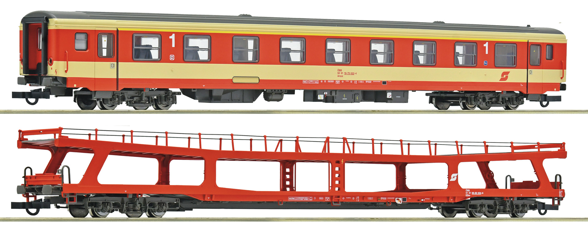 Bestehend aus einem Inlandsreisezugwagen 1. Klasse, Gattung Ampz und einem Autotransportwagen, Gattung DDm.