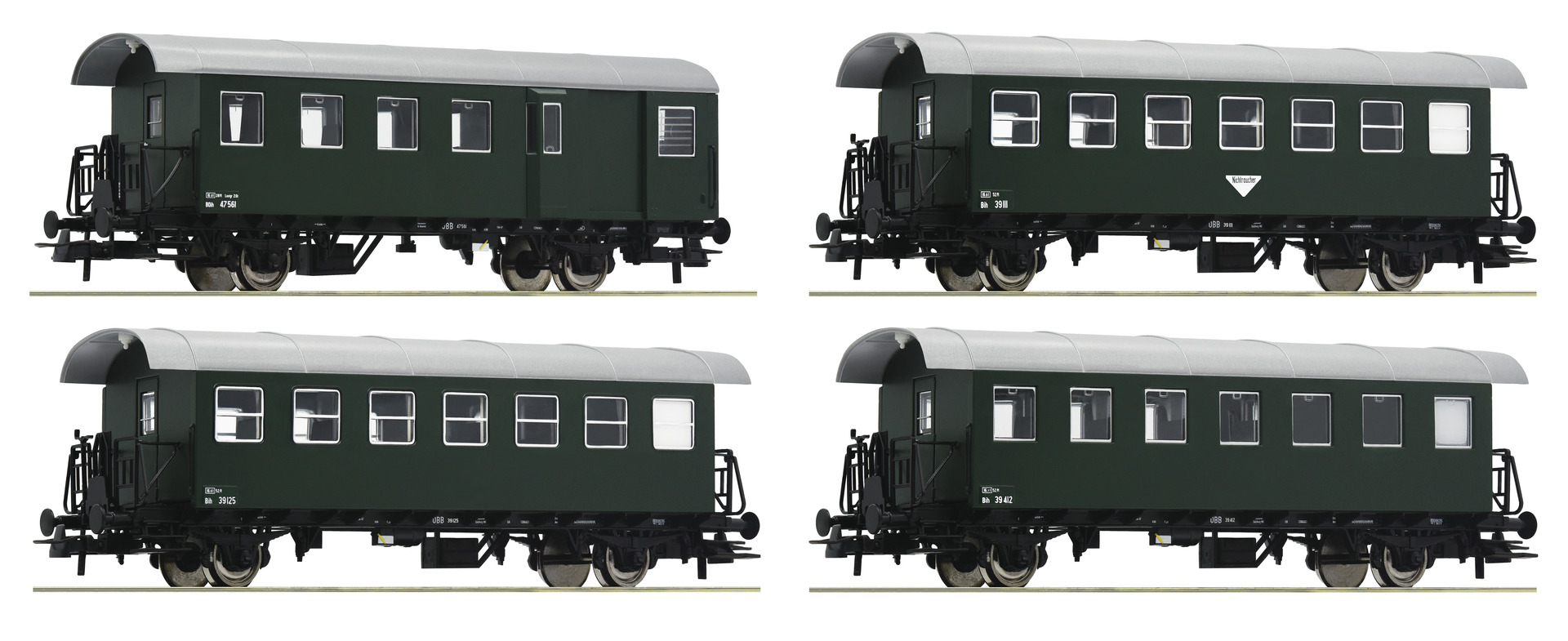 Set bestehend aus zwei Wagen mit Halbfenstern, Gattung Biho, einem Wagen mit Ganzfenstern, Gattung Biho und einem Halbgepäckwagen mit Raucherabteil, Gattung BDiho.