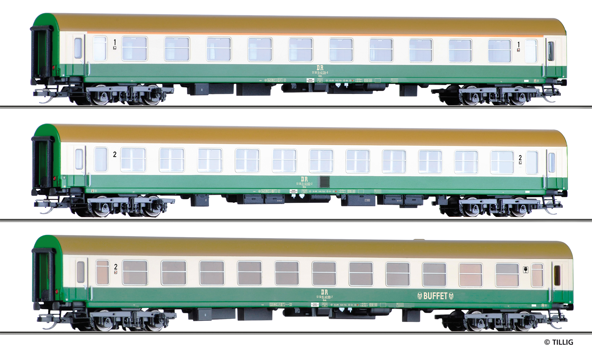 Reisezugwagenset der DR, bestehend aus einem Reisezugwagen 1. Klasse, Bauart Halberstadt, einem Reisezugwagen 1./2. Klasse, Bauart Halberstadt, und einem Reisezugwagen 2. Klasse mit Buffetabteil, Bauart Halberstadt, Ep. IV