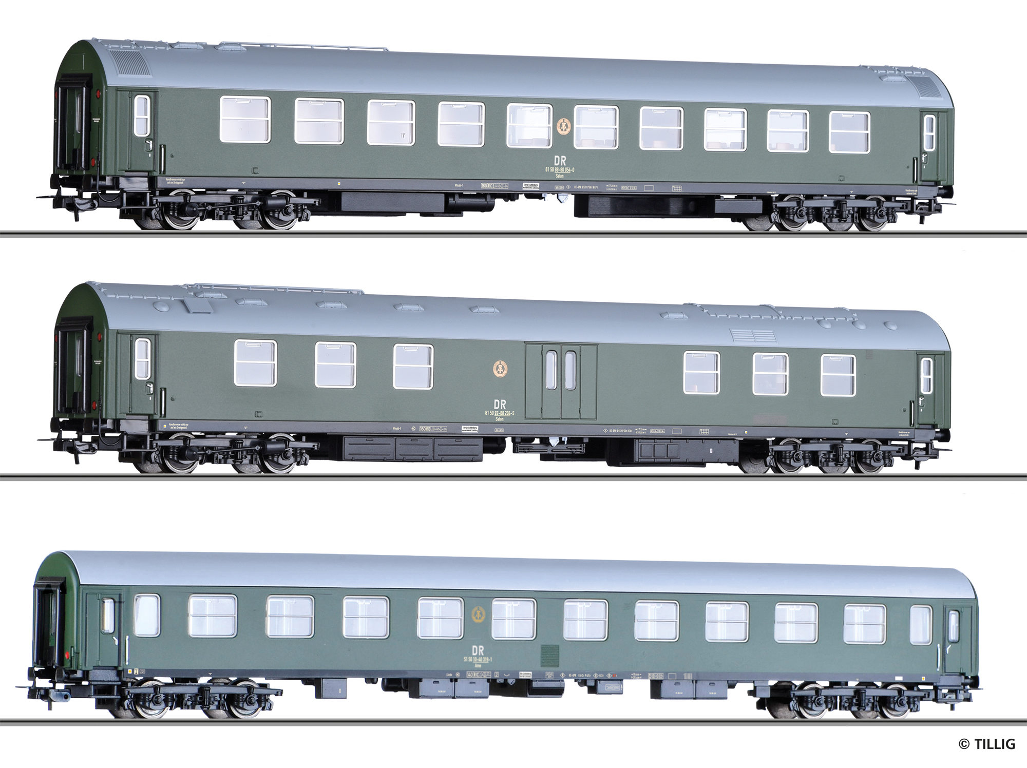 Reisezugwagenset Salonwagenzug 4 der DR, bestehend aus Salonspeisewagen mit Küche, Maschinen-Gepäckwagen und Verstärkungswagen