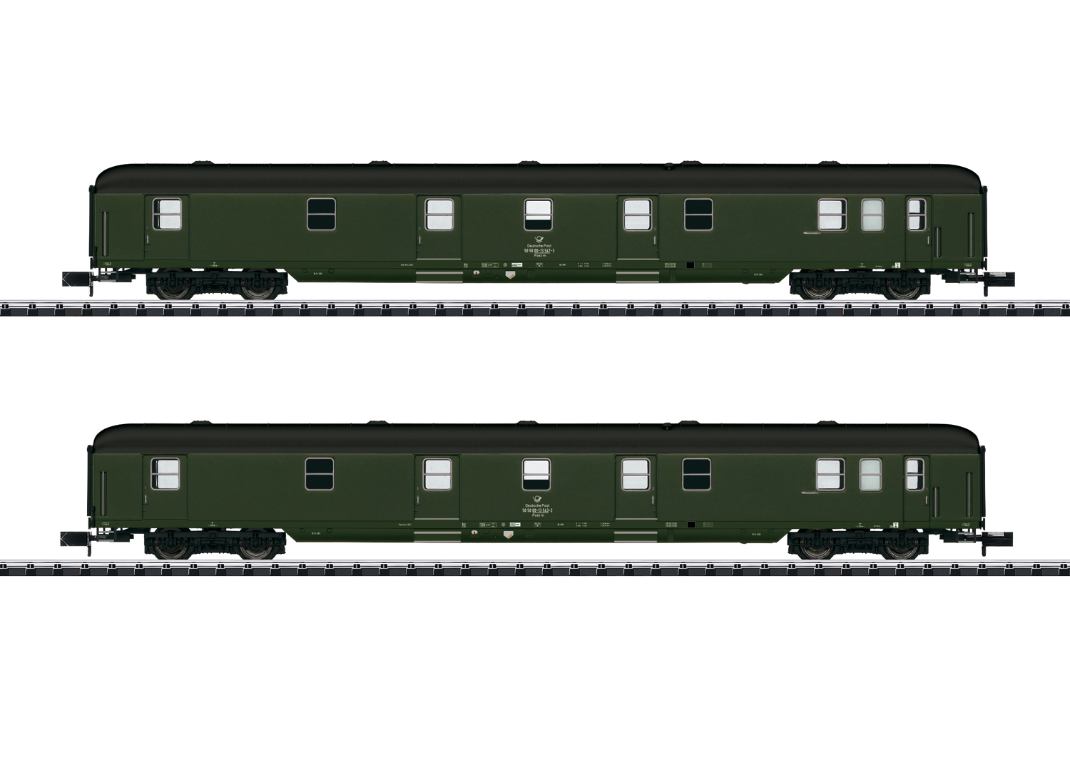 Vorbild: 2 Postwagen der Bauart Poste-c/26,1-54, in der Ausführung der Deutschen Post eingesetzt bei der Deutschen Reichsbahn (DR)als Gepäck- und Expressgutzüge (Gex) für Rollbehälter. Betriebszustand im Jahr 1988.