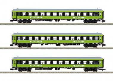 Schnellzugwagen-Set FlixTrain - Vorbild: 3 Schnellzugwagen 2. Klasse der Bauart Bmmz 264.4F und 264.4. Hellgrüne Grundfarbgebung. Privatwagen der Firma Trainpool GmbH & Co. KG, vermietet an FlixTrain GmbH, München. Betriebszustand um 2020. Modell: Alle Wagen mit Kinematik für Kurzkupplung. Vorbereitet für den nachträglichen Einbau einer Innenbeleuchtung.Gesamtlänge über Puffer 495 mm. Die dazu passende Innenbeleuchtung: 66616 LED-Innenbeleuchtung. Einen vorbildgerechten Zug erhalten Sie mit der Lokomotive der Baureihe 193 Artikelnummer 16835 und mit den Schnellzugwagen aus 15462 und 15797.