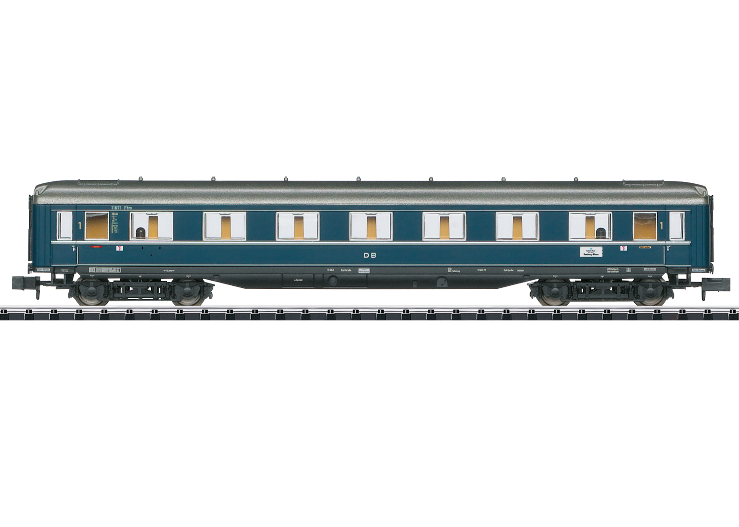 Schnellzugwagen A4üe - Modell: Wagen mit Kinematik für Kurzkupplung. Vorbereitet für den nachträglichen Einbau einer Innenbeleuchtung.Länge über Puffer 136 mm.Die dazu passende Innenbeleuchtung: 66616 LED-Innenbeleuchtung. Vorbild: Schnellzugwagen 1. Klasse A4üe (windschnittige Bauart ABü-38) der Deutschen Bundesbahn (DB). Zuglauf: F 41 Senator Frankfurt (Main) – Kassel - Hannover - Hamburg-Altona um 1957. Einen vorbildgerechten Zug erhalten Sie mit der Lokomotive der Baureihe V 200 Artikelnummer 16225 und mit dem Schnellzugwagen-Set 18259.