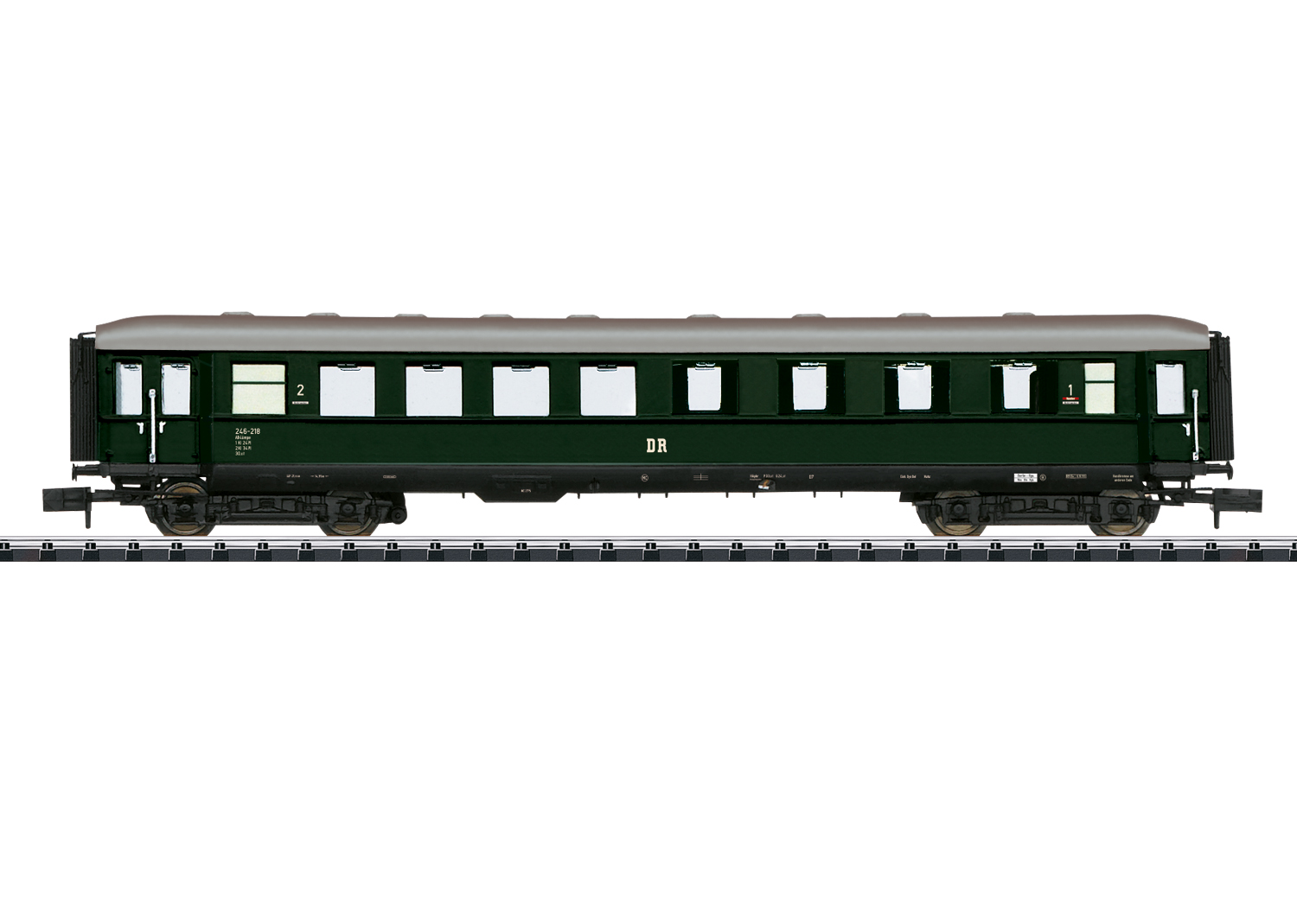 Personenwagen AB4ümpe - Modell: Wagen mit Kinematik für Kurzkupplung, mit Drehgestellen in Blechrahmenauführung. Vorbereitet für den nachträglichen Einbau einer Innenbeleuchtung.Länge über Puffer 134 mm. Vorbild: Eilzugwagen 1./2. Klasse windschnittiger Bauart AB4ümpe im Zustand um 1959 der Deutschen Reichsbahn (DR) in flaschengrüner Farbgebung. Die dazu passende Innenbeleuchtung:66616 LED-Innenbeleuchtung. Einen kompletten Zug erhalten Sie mit dem Eilzugwagen 18426 und der Dampflokomotive Baureihe 38 mit der Artikelnummer 16386.