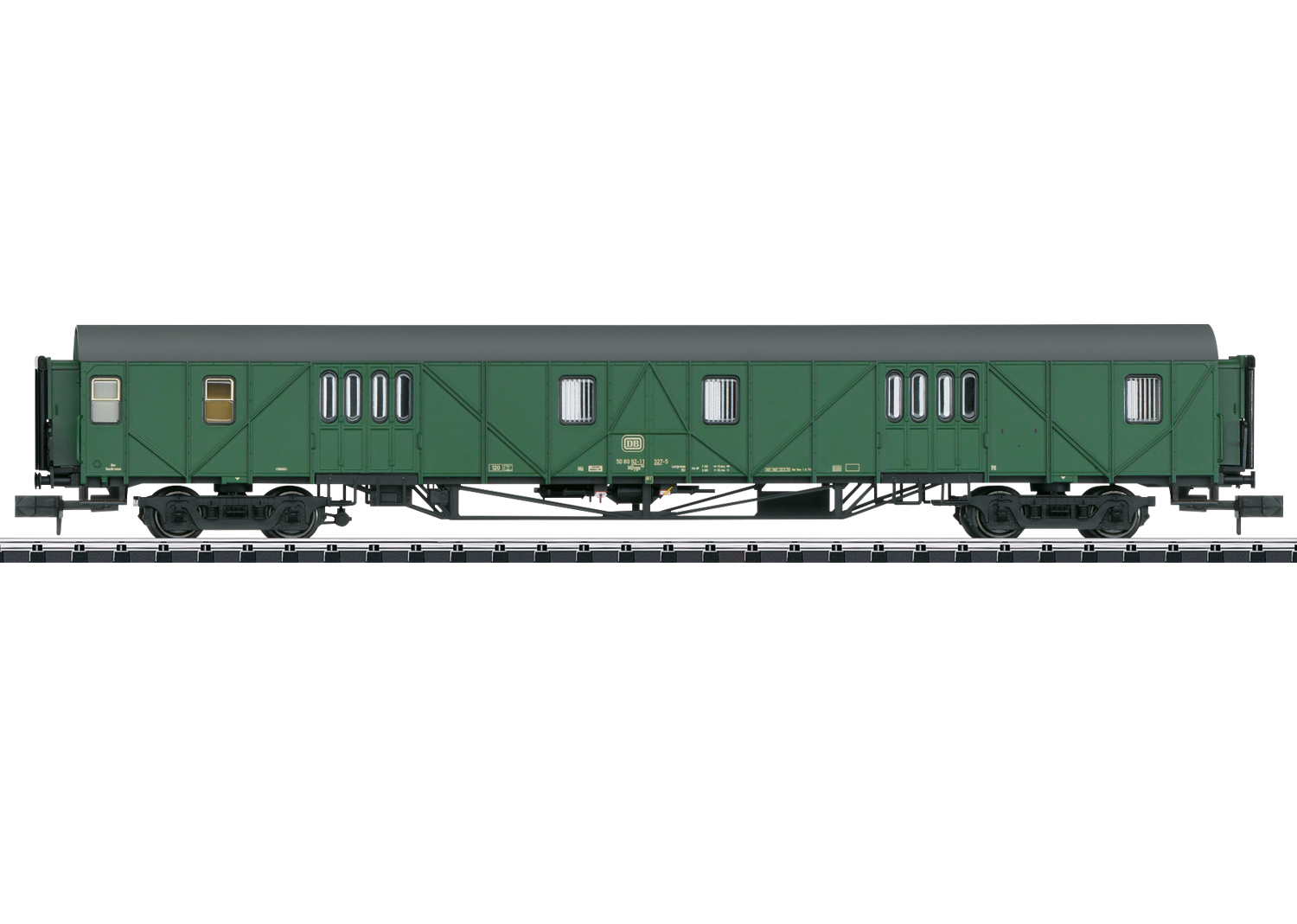 Vorbild: Expressgut-Gepäckwagen als Behelfsgepäckwagen MDyge 986, mit plattenbekleideten Wänden der Deutschen Bundesbahn (DB), in der Farbgebung chromoxidgrün, im Zustand um 1979.