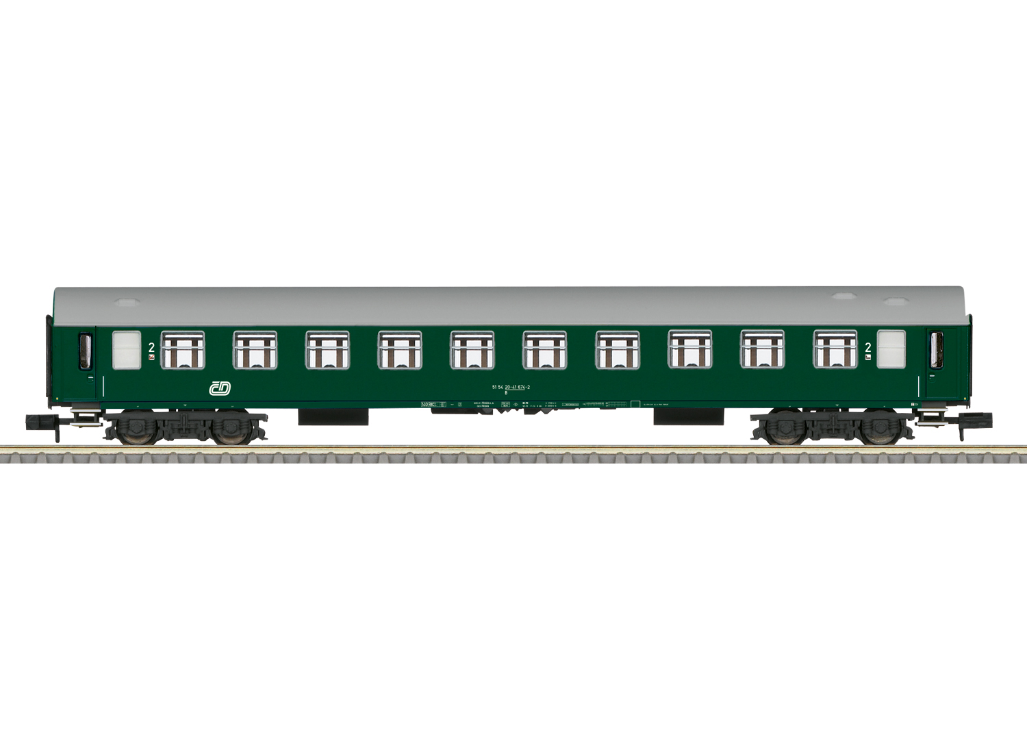 Schnellzugwagen Bauart Y/B - Vorbild: 1 Schnellzugwagen 2. Klasse der Bauart Y/B der Tschechischen Eisenbahn (#eské drahy #D) in moosgrüner Farbgebung. Baujahr ab 1968.Modell: Mit Kinematik für Kurzkupplung. Vorbereitet für den nachträglichen Einbau einer Innenbeleuchtung.Länge über Puffer 153 mm.Die dazu passende Innenbeleuchtung:66616 LED-Innenbeleuchtung.Ergänzungswagen zum Personenwagen-Set 18251.