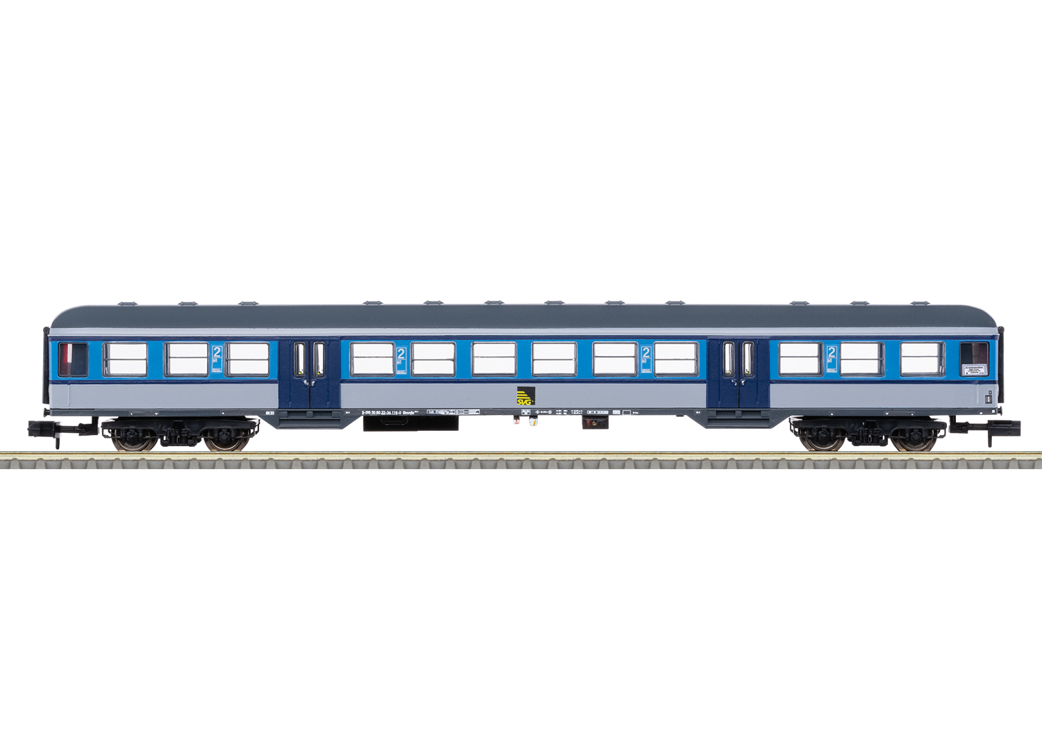 Personenwagen Bnrz 451 - Vorbild: Nahverkehrswagen 2. Klasse (Betriebsnummer 50 80 22-34 116-0) in Farbgebung der Schienenverkehrsgesellschaft mbH (SVG).Einsatz: Sonder-, Regionalbahn- und Regionalexpress-Züge um 2022Modell: Mit Kinematik für Kurzkupplung. Vorbereitet für den nachträglichen Einbau einer Innenbeleuchtung.Länge über Puffer 165 mm.Die dazu passende Innenbeleuchtung: 66616 LED-Innenbeleuchtung.Einen vorbildgerechten Zug erhalten Sie mit der Lokomotive der Baureihe 218 Artikelnummer 16826 sowie mit den Wagen Artikelnummern 18551 bis 18555.