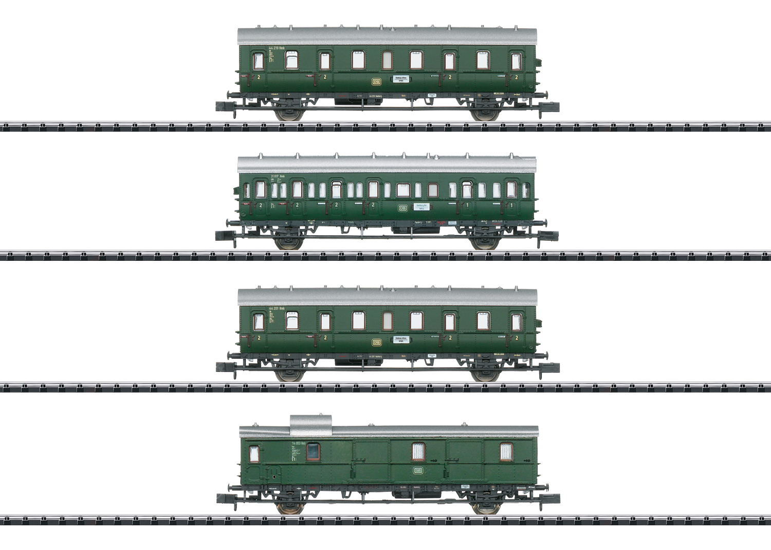 Wagen-Set Nahverkehr um Hamburg - Vorbild: 1 Einheits-Abteilwagen 1./2. Klasse AB-21, 2 Einheits-Abteilwagen 2. Klasse Bd-21b, 1 Gepäckwagen Pwi-23 im Zustand um 1960 der Deutschen Bundesbahn (DB).Modell: Alle Wagen mit Kinematik für Kurzkupplung. Gesamtlänge über Puffer 350 mm.