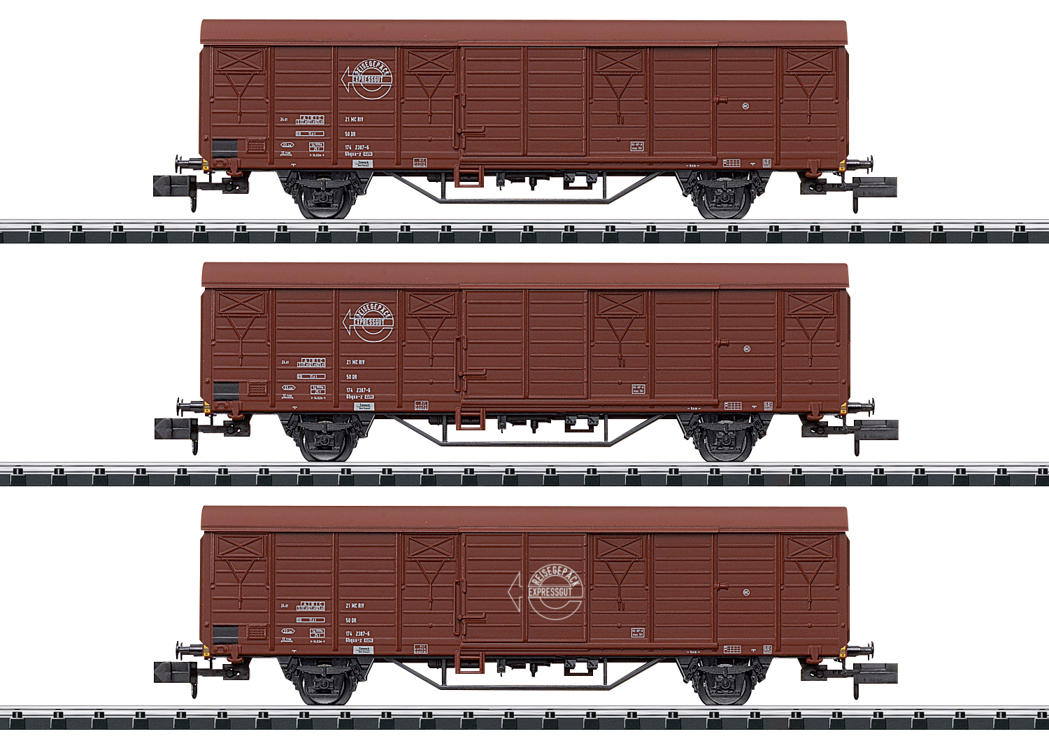 3 gedeckte Güterwagen Bauart Gbqss-z 1742 (ehemals Gbs 1500 der DR) der Deutschen Reichsbahn (DR). Ausführung um 1980. Einsatz: Für nässeempfindliche und besonders eilige Güter.