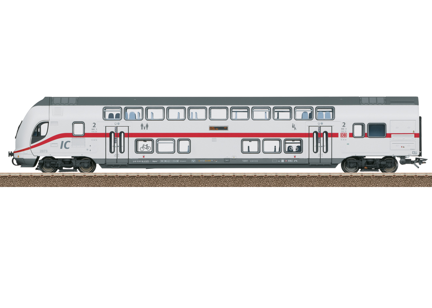 IC2 Doppelstock-Steuerwagen DBpbzfa 668.2, 2. Klasse - Modell: Befahrbarer Mindestradius 360 mm. Mit Tief-Einstieg zwischen den Drehgestellen. Serienmäßig mit eingebauter LED-Innenbeleuchtung auf beiden Ebenen und stromführender, trennbarer Kurzkupplung an der Wagen-Seite ohne Führerstand. Beleuchtete stirnseitige Zugziel-Anzeige über dem Führerstand, digital separat schaltbar. Beleuchtete längsseitige Zugzielanzeigen. Innenbeleuchtung und längsseitige Zugzielanzeigen können im Verbund mit den weiteren Doppelstock-Mittelwagen über einen Decoder im Steuerwagen digital ein- und ausgeschaltet werden. Dazu ist eine definierte Fahrzeugreihenfolge vorgegeben. 3-Licht-Spitzensignal und 2 rote Schlusslichter mit der Fahrtrichtung wechselnd, digital separat schaltbar. Fernscheinwerfer zusätzlich separat digital schaltbar. Lichtwechsel, Innenbeleuchtung und längsseitige Zugzielanzeigen konventionell in Betrieb. Durch Entfernen einer Blende an der Führerstandseite kann eine normale Kupplung eingesetzt werden, zum Anhängen an eine Lokomotive. Stirnseitig rot transparente Schlusslicht-Einsätze am Wagenende ohne Führerstand. Vorbildgerechte Drehgestelle der Bauart Görlitz.Länge über Puffer 29,2 cm. Vorbild: IC2 Doppelstock-Steuerwagen DBpbzfa 668.2, 2. Klasse, der Deutschen Bahn AG (DB AG) für den Fernverkehr. Lichtgraue Fernverkehrs-Farbgebung mit verkehrsrotem Zierstreifen, im aktuellen IC-Design. Zuglauf: IC 2045 von Köln nach Dresden Hbf. Wagen-Ordnungsnummer 1. Betriebszustand 2020. Die passende Elektrolokomotive der Baureihe 146.5 finden Sie ebenfalls im Trix H0-Sortiment unter der Artikelnummer 25449, zur Bildung einer vorbildgerechten 6-teiligen Zugeinheit mit den Doppelstockwagen 23253, 23254, 23255, 23256 und 23257.Ein Befahren von gebogenen Rampenstücken ist gegebenenfalls nur nach entsprechender Modifikation dieser Auffahrten möglich. Dieses Modell finden Sie in Gleichstromausführung im Märklin H0-Sortiment unter der Artikelnummer 43488. Neuer vorbildgerechter Zuglauf: IC 2045 von Köln nach Dresden HbfWagen-Ordnungsnummer 1Serienmäßig mit LED-InnenbeleuchtungInnenbeleuchtung im ganzen Wagenverband über Decoder im Steuerwagen digital schaltbarSpitzenbeleuchtung und Fernlicht zusätzlich digital schaltbar Lange mussten Bahnreisende auf neue Fahrzeuge im Fernverkehr warten, doch am 23. September 2015 kam schließlich Bewegung in die IC-Züge der nächsten Generation. Die Doppelstock-ICs (IC2) von Bombardier erhielten die vorläufige Zulassung des EBA. Bei diesen Neufahrzeugen handelt es sich nun um Wendezug-Kompositionen, bestehend aus einer Elektrolok der Reihe 146.5 (TRAXX P160 AC2) sowie fünf Doppelstockwagen des Typs TWINDEXX 2010. Die Innenausstattung der Wagen glänzt durch ein modernes Ausstattungs- und Komfortniveau. Die fünfteilige Doppelstock-Garnitur bietet 465 Sitzplätze, 70 davon in der 1. Klasse. In Dienst gestellt wurden 27 Züge, die betrieblich als Einheiten mit den Nummern 2850-2876 geführt werden. Ihr Einsatz erfolgt vorwiegend auf den IC-Linien 35 (Norddeich – Emden – Münster – Düsseldorf – Köln – Koblenz), 55 (Dresden – Leipzig – Hannover – Köln) und 56 (Leipzig – Magdeburg – Hannover – Norddeich).