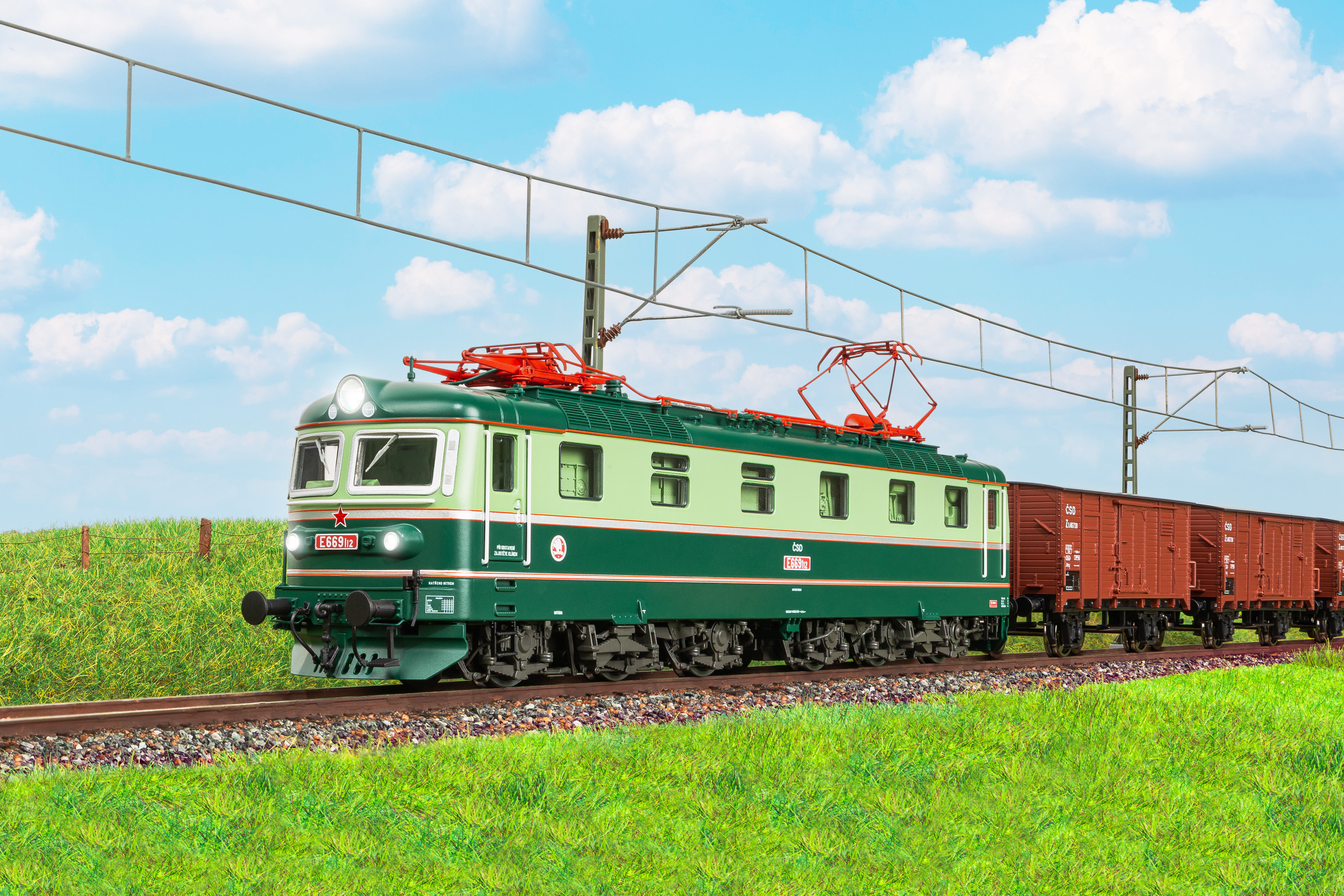 Neuheit 2025: Die sechsachsigen Elektrolokomotiven der Baureihe E 669.1 haben sich über mehr als ein halbes Jahrhundert im schweren Güterverkehr bewährt. Sie entstanden aus den beiden Prototypen der Gattung E 660.0, mit dem Ziel bisher in Doppeltraktion bespannte Güterzüge zu vermeiden. Anfang der 1960er-Jahre von ?koda an die Tschechoslowakische Staatsbahn (?SD) geliefert, kamen die insgesamt 150 gebauten Exemplare im Gleichstromnetz im Norden und Osten der ehemaligen Tschechoslowakei zum Einsatz. Mit der Auflösung der Tschechoslowakei 1993 kam die gesamte, nun als 181 geführte Baureihe, zu den neuen Tschechischen Bahnen (?D). Als Schubloks sind auch heute noch fünf Exemplare unter der Ägide von ?D Cargo in Betrieb.