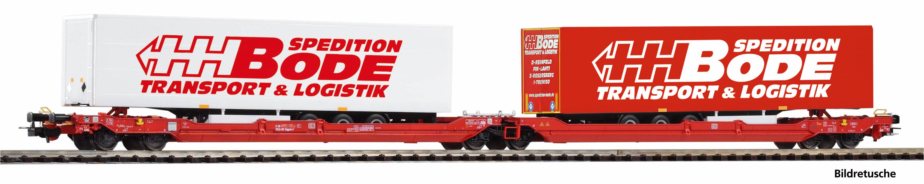 Neuheit 2025: Designvariante des Taschenwagens T3000e der DB AG in Epoche VI. Das Modell ist mit zwei Aufliegern der Bode-Spedition ausgestattet.