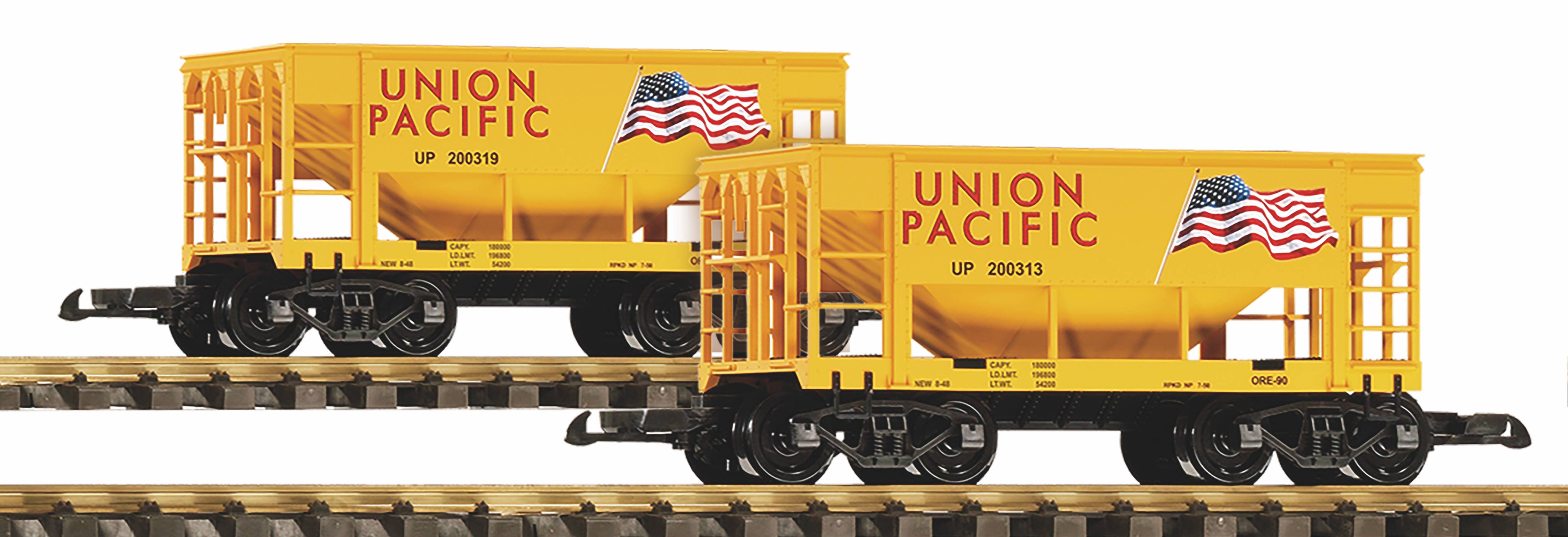 Neuheit 2023: Zweierset 4-achs. Schüttgutwagen der Union Pacific Railroad mit amerikanischer Flagge
