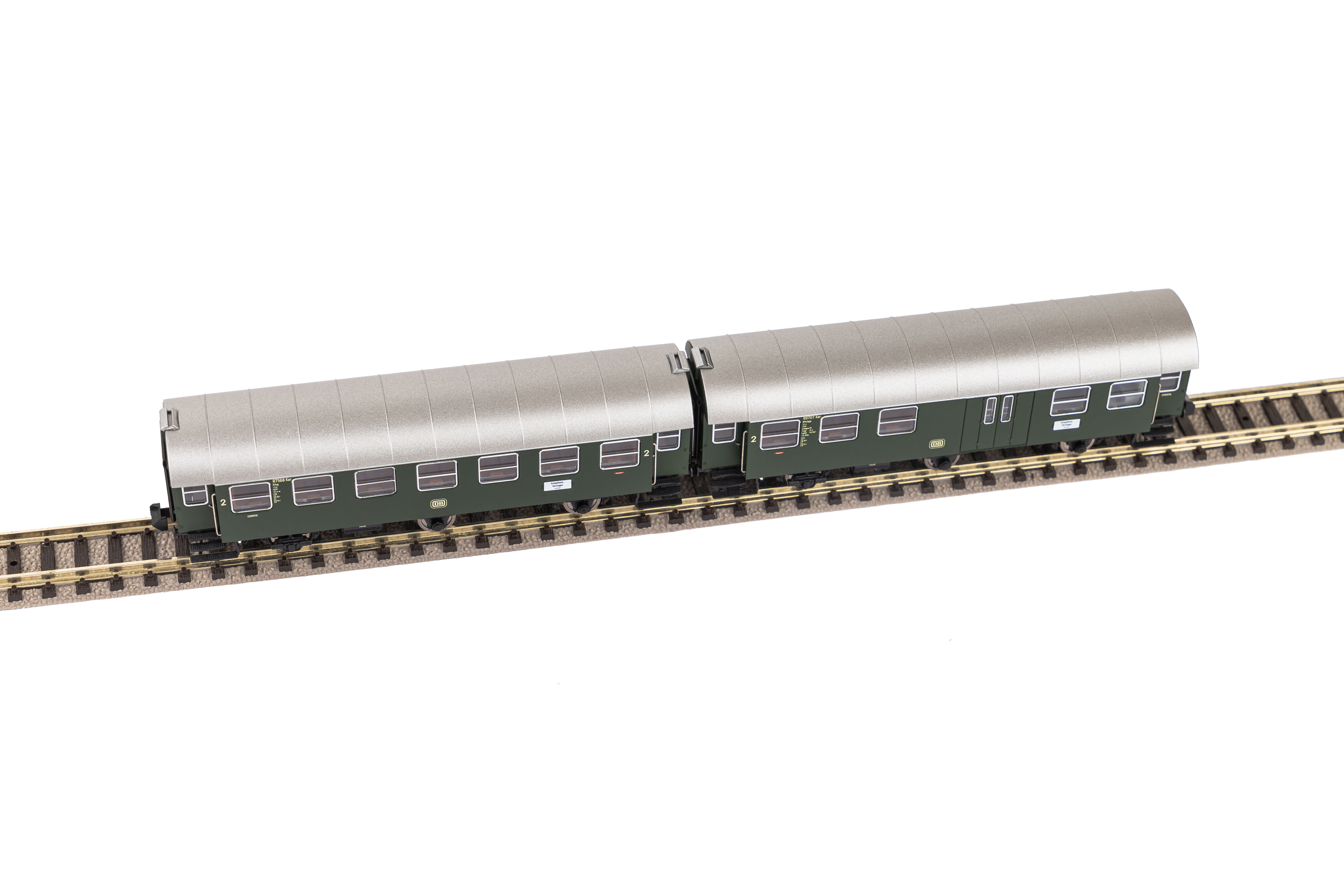 Neuheit 2024: Ab Mitte der 1950er-Jahre entstanden durch Umbau von Länderbahn-Abteilwagen bei der Deutschen Bundesbahn zwei Reisezug-Wagenserien, die als Umbauwagen bezeichnet werden. Anders als beim Vorbild wurde für die PIKO Modelle der dreiachsigen Umbauwagen nicht auf vorhandene Teile zurückgegriffen. Bei den Wagen handelt es sich um vollständige Neukonstruktionen. Die maßstäblichen Fahrzeuge geben das Original bis ins kleinste Detail wieder. Einzeln angesetzte Griffstangen gehören genauso zur zeitgemäßen Konstruktion wie bündig abschließende, glasklare Fenster und eine detaillierte Inneneinrichtung. Die liebevolle Gestaltung setzt sich am Wagenboden fort. Er überzeugt unter anderem durch freistehende Leitungen und ein filigranes Bremsgestänge. Wie das Vorbild erscheinen auch die N Umbauwagen als kurzgekuppelte Pärchen im Handel und verfügen über einen vorbildnahen Abstand zwischen den Wagen. Zusammen mit dem PIKO Lokomotivmodell der Baureihe E 32 (Art.-Nr. 40820) lassen sich vorbildgerechte Zugverbände bilden, die zum absoluten Blickfang auf jeder Anlage werden.