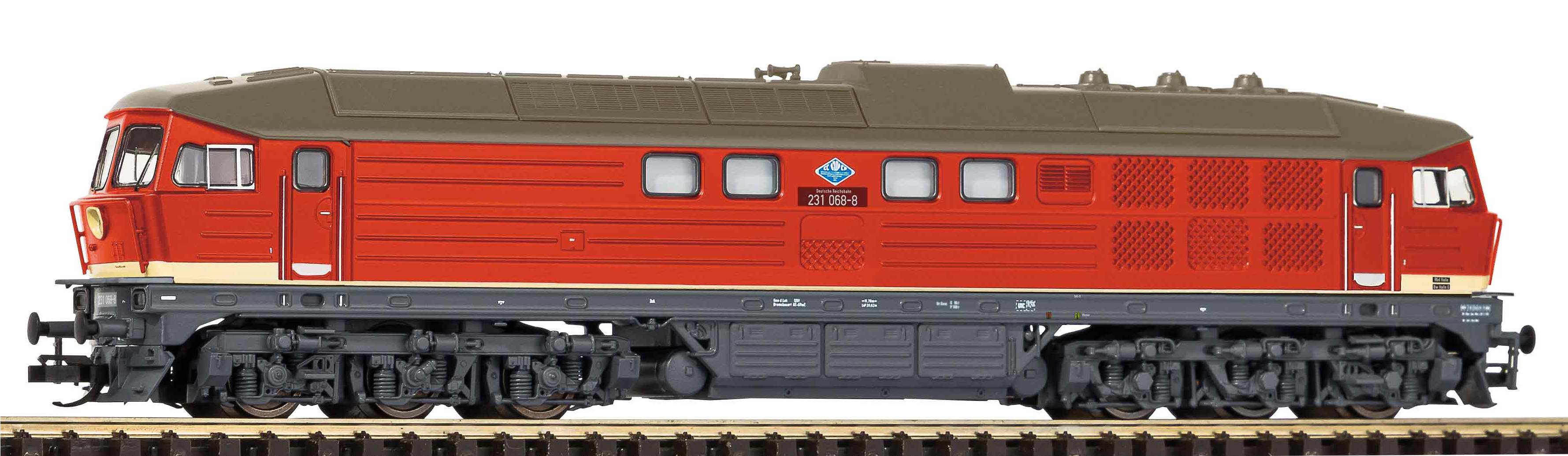 Neuheit 2024: Druckvariante der BR 231 der DR in Epoche IV. Das Modell besitzt vorbildgerechte Stirn- und Seitenfenster, Handlaufstangen vor den Führerständen und eine vorbildentsprechende Dachgestaltung mit unterschiedlichen Lüftern. Der schwere Zinkdruckguss-Rahmens verleiht dem PIKO "Ludmilla" Modell eine dem Vorbild nachempfundene Wucht, trägt zu ausgezeichneten Laufeigenschaften bei und sorgt für enorme Zugkraft. Der Motor im Maschinenraum erscheint in angravierter Gestalt. Vorbildkenner dürften die präzise nachgebildeten Drehgestelle samt Radsätzen überzeugen. Dank der PluX16-Schnittstelle ist der Einbau eines Digital- und Sounddecoders problemlos möglich. Darüber hinaus ist das Modell für die Nachrüstung mit Sound vorbereitet. Das Modell verfügt über TT Kurzkupplungen!