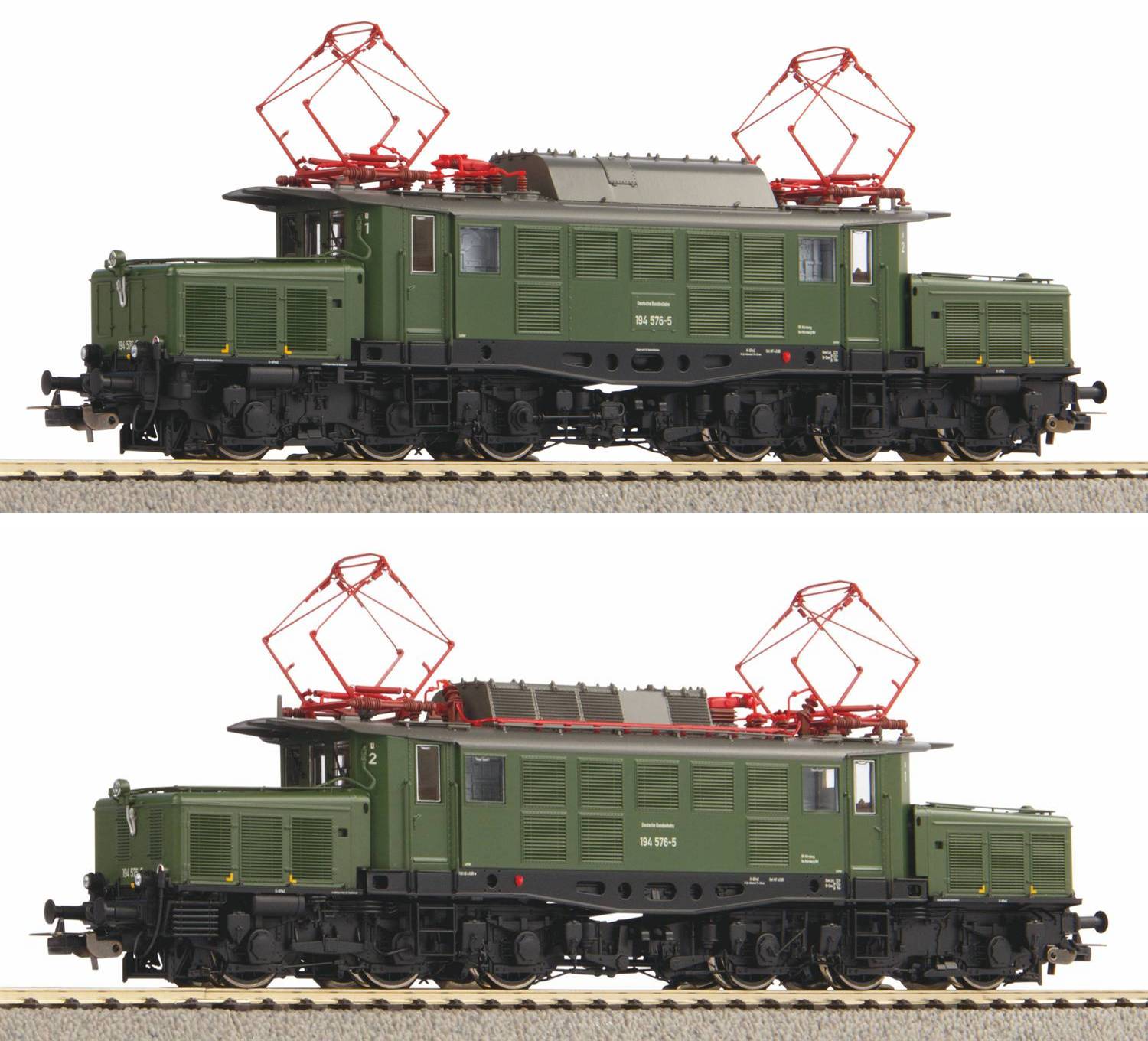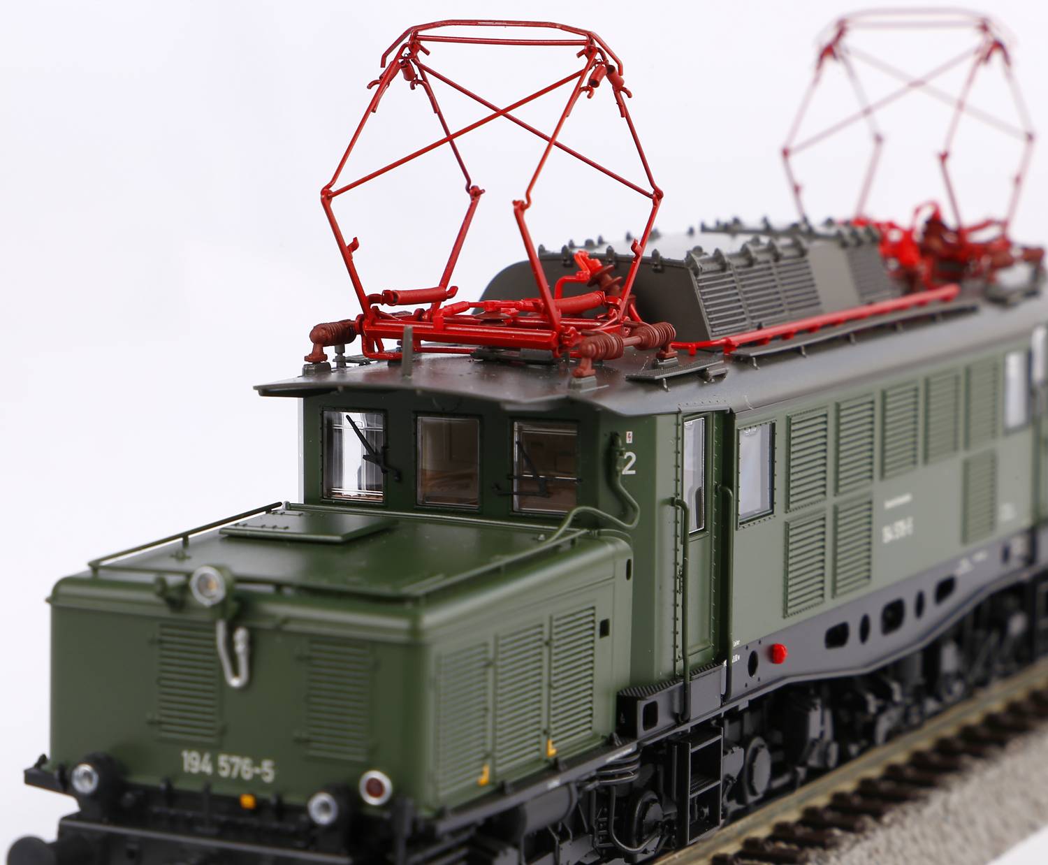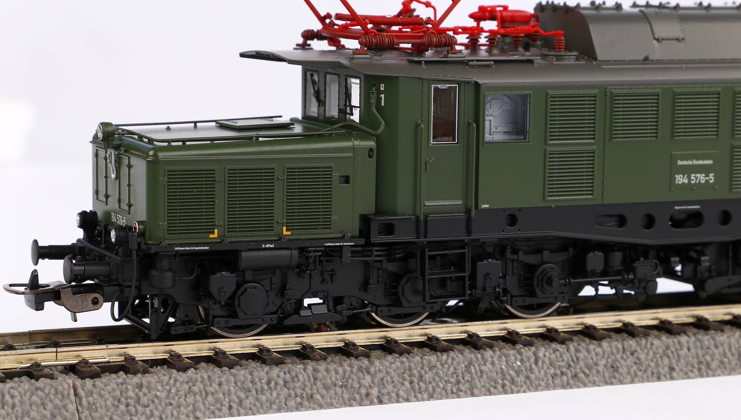 Ein markantes Vorbildfahrzeug wie die E 94 formvollendet in die Baugröße H0 zu übertragen ist immer eine Herausforderung. Den PIKO Konstrukteuren ist dieses Kunststück mit Bravour gelungen. Entstanden ist ein Modell, das Gesamterscheinung wie Eigenheiten der E 94/BR 194 hervorragend in 1:87 wiedergibt. Dank einer Schwalbenschwanzführung zwischen den Motorvorbauten und dem Brückenrahmen liegt das Modell satt im Gleis und ist gleichzeitig sehr agil. Der Mittelmotor mit zwei Schwungmassen sorgt für einen ruhigen Lauf, die Zugkraft wird durch zwei diagonal angeordnete Haftreifen erhöht. Im Zusammenspiel mit einem Digitaldecoder lassen sich viele vorbildgerechte Lichtfunktionen schalten, unter denen die Anfahrleuchten unterhalb der Führerstandsfenster einen besonderen Stellenwert einnehmen. Das Modell ist für die einfache Nachrüstung mit einem Digitaldecoder sowie Sound vorbereitet.