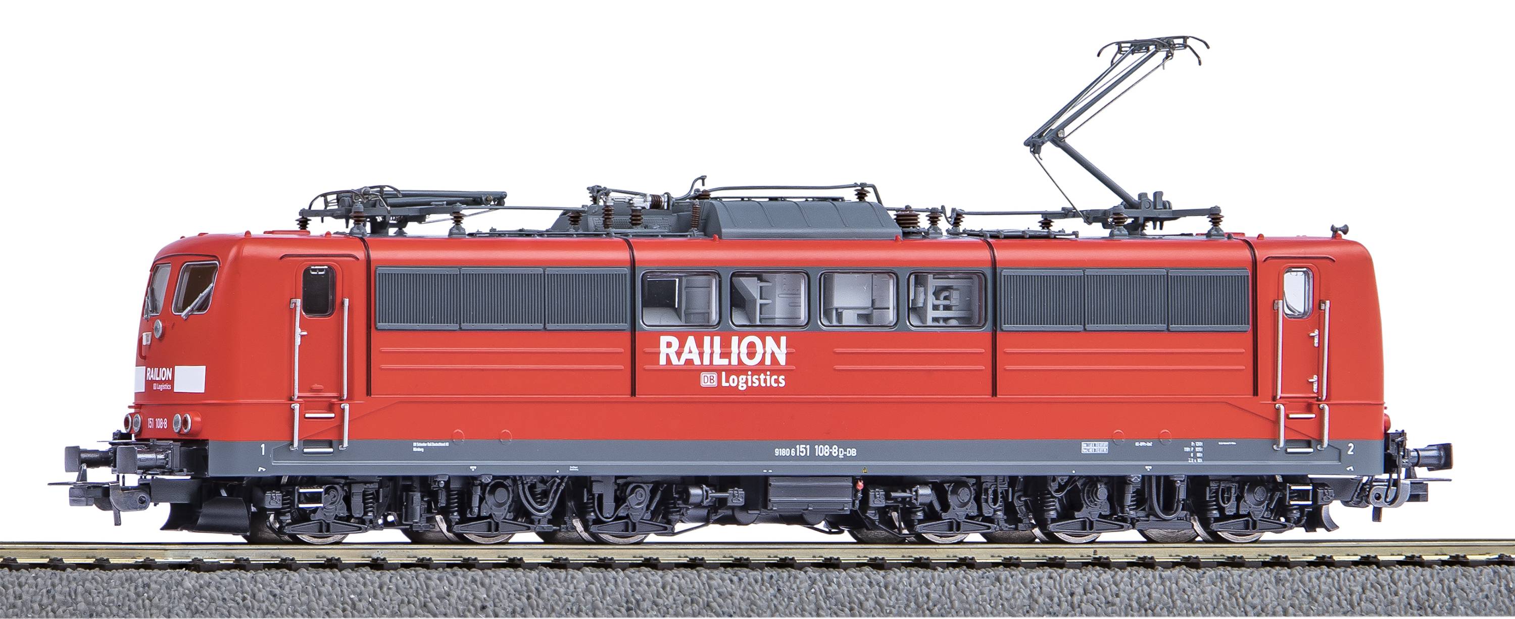 Das PIKO Modell der Elektrolok der BR 151 mit Bedruckung der Railion DB Logistics zeigt alle relevanten Details seines Vorbildes auf und überzeugt durch feinste Lackierung und Bedruckung, die exakte Gehäuseform, angesetzten Griffstangen, Maschinenraumdurchblick, scharf gravierte Drehgestellblenden und filigranen Metall-Pantographen. Der LED-Lichtwechsel erfolgt fahrtrichtungsabhängig weiß/rot mittels LEDs. Die serienmäßig eingebaute Führerstands- und Maschinenraumbeleuchtung und die fahrtrichtungsabhängig funktionierenden Schlusslichter sind mit einem PluX22 Decoder digital schaltbar. Der fünfpolige Motor sorgt mit zwei Schwungmassen für ausgezeichnete Fahreigenschaften. Das schwere Modell mit hohen Zugkräften besitzt eine Digitalschnittstelle PluX22 nach NEM 658 und ist für eine einfache Nachrüstung mit Sound und größtmöglichem Lautsprecher vorbereitet. Bremsschläuche zum Nachrüsten liegen bei.
