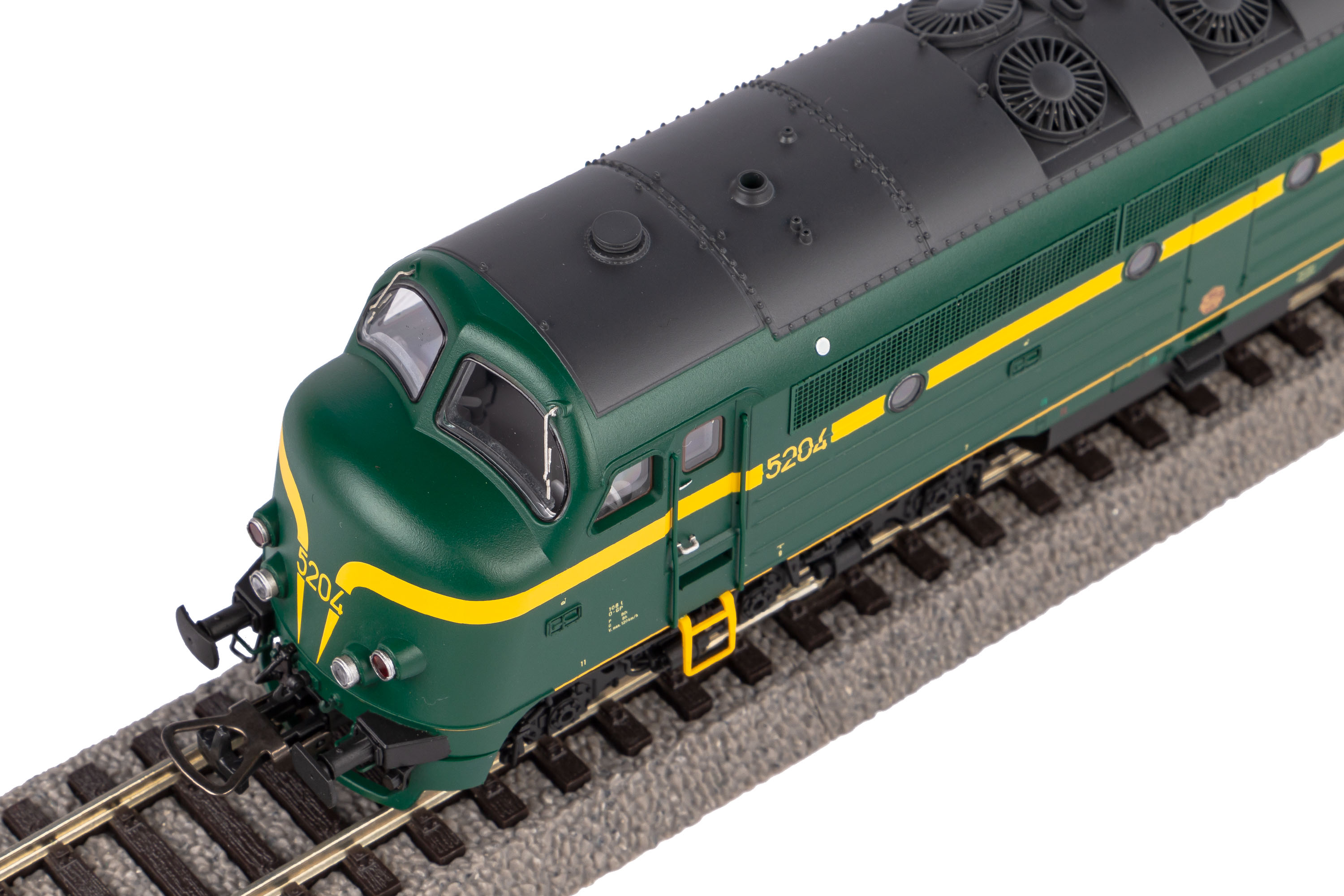Über Geschmack lässt sich trefflich streiten, es gibt jedoch Dinge, deren Eleganz über jeden Zweifel erhaben ist. Von der unbestrittenen Eleganz des Vorbilds dürfen auch die neuen PIKO Modelle der NoHAB profitieren. Um diesen Gesamteindruck zu erreichen wurde großer Wert auf Details gelegt. Die seitlichen Lüftungsgitter werden als stark gliedernde Elemente des Lokkastens mit feinen Ätzteilen ausgeführt und sind ein absoluter Blickfang. Aber auch die markanten stirnseitigen Scheiben sowie die seitlichen "Bullaugen" tragen durch den perfekt bündigen Sitz zum hervorragenden Bild bei. Vollendet wird der Eindruck durch die präzise und hochdetaillierte Gestaltung der Drehgestelle. Als Antrieb dient ein kräftiger und laufruhiger Motor mit zwei Schwungmassen. Verschiedene Beleuchtungsfunktionen und der kernige Klang der Soundversionen sorgen für abwechslungsreichen Betrieb auf der Anlage. Das Modell der Serie 52 der SNCB verfügt in der Soundversion bereits ab Werk über einen mfx®-fähigen PluX22-SoundDecoder.