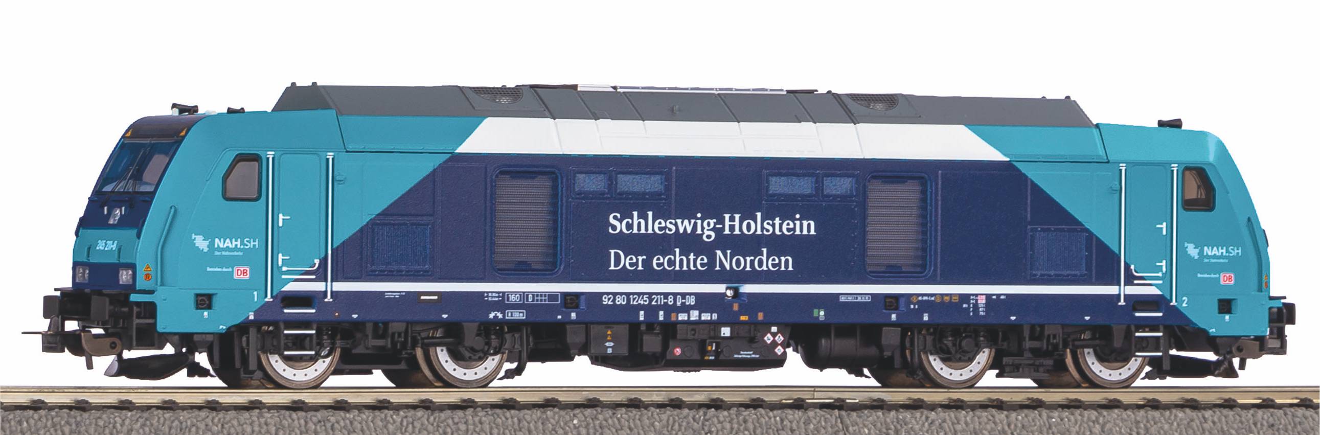 Druckvariante der BR 245 der DB AG in Epoche VI im Design von NAH.SH. Bei dem Modell der Baureihe 245 berücksichtigt PIKO alle Änderungen der Serienlokomotiven bei der Anzahl und Ausführung der Dach- und Seitenlüfter gegenüber der Baumusterfahrzeuge und gibt diese originalgetreu wieder. Das Modell überzeugt durch die exakte Lackierung und Bedruckung, geätzte Metalllüftungsgitter, scharf gravierte, vorbildgetreue Drehgestelle und viele montierte freistehende Teile, wie die Frontgriffstangen. Der schwere Rahmen aus Zinkdruckguss und der Motor mit zwei großen, präzise ausgewuchteten Schwungmassen sorgen für ausgezeichnete Fahreigenschaften und hohe Zugkräfte. Die Führerstandbeleuchtungen und die fahrtrichtungsabhängig funktionierenden Front- und Schlusslichter sind mit einem PluX22 Decoder digital schaltbar. Das Modell verfügt über eine aufgeräumte Platine mit PluX22-Schnittstelle und ist für eine unkomplizierte Nachrüstung mit Sounddecoder und großem Lautsprecher vorbereitet.