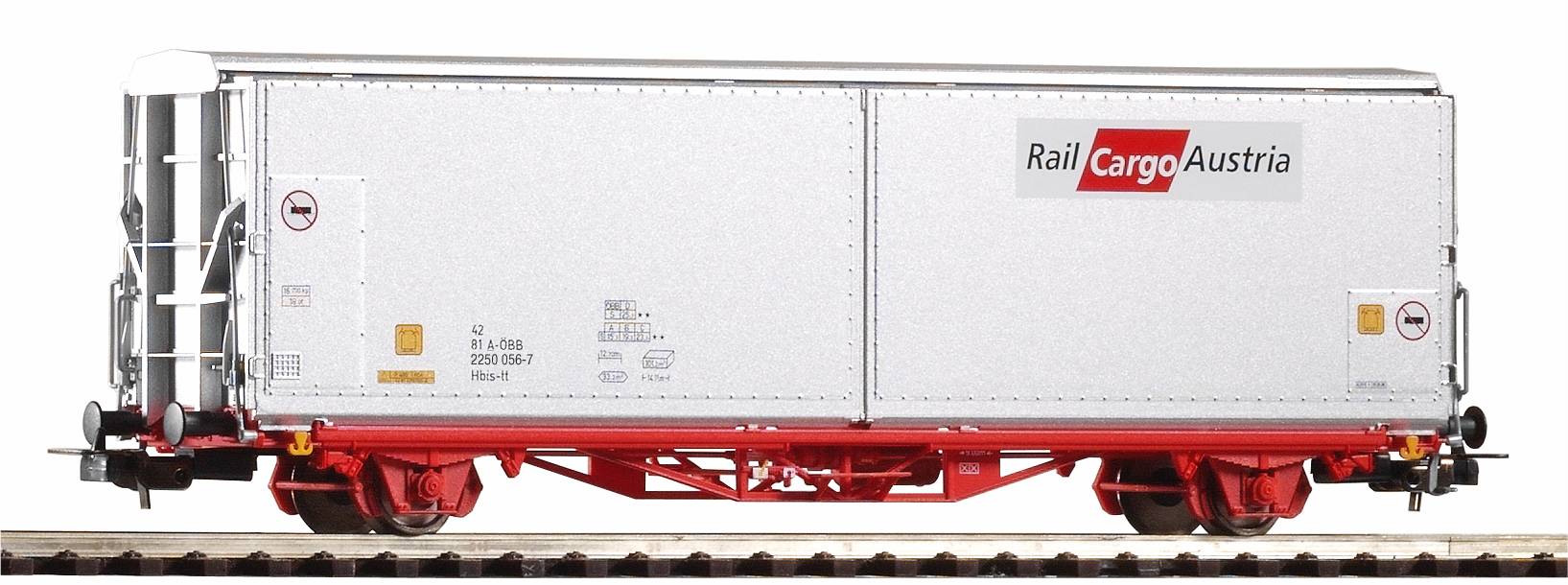 Druckvariante des Großraumschiebewandwagens Hbis-tt im Design Rail-Cargo Austria der Epoche V.