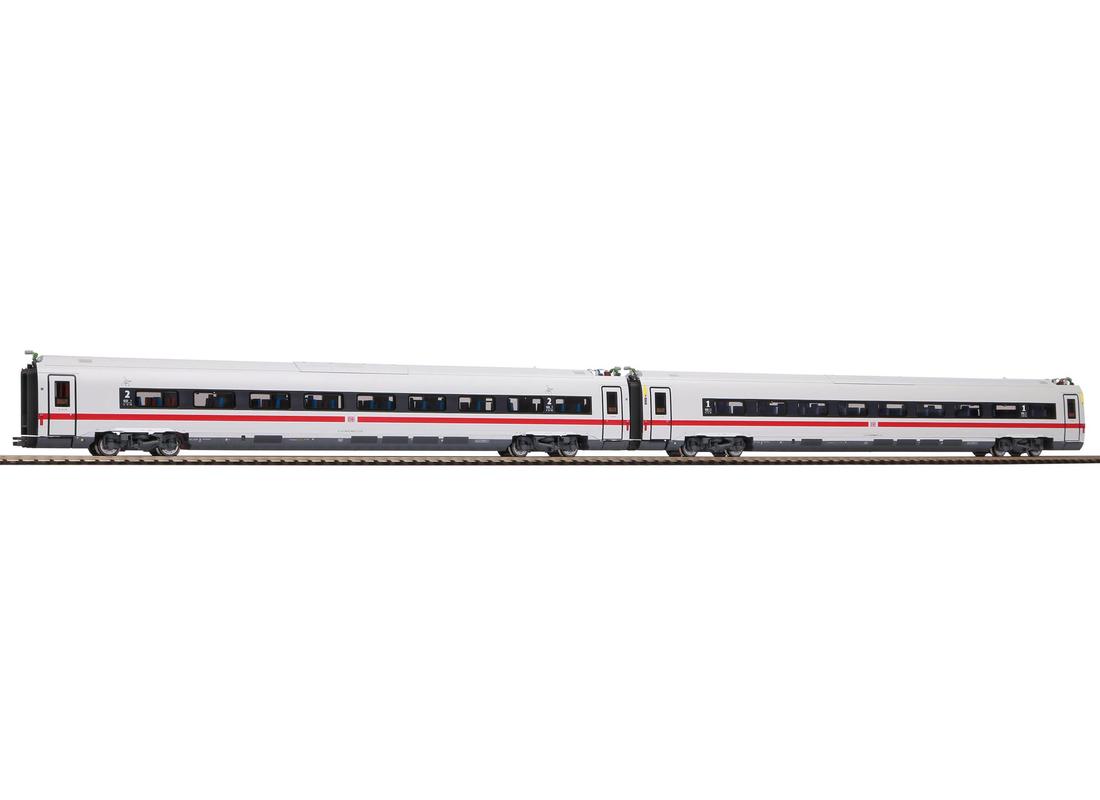 AC Ausführung, 2er Set Ergänzungswagen zum PIKO ICE 4 der DB AG Ep. VI. Die Deutsche Bahn AG beauftragte 2011 Siemens Mobility mit dem Bau von bis zu 300 neuen Hochgeschwindigkeitszügen für den Einsatz in Deutschland, Österreich und der Schweiz. Die neuen Triebzüge der BR 412/812, die gemeinsam von Siemens und Bombardier entwickelt werden, werden über mehrere Wagen, sogenannte Powercars, angetrieben. Die Zugkonfiguration sieht hierbei verschiedene modular aufgebaute Einheiten von fünfteiligen bis zu 14teiligen Zügen vor. Durch dieses Konzept kann der Zug problemlos an die individuellen Vorgaben der Verkehrsunternehmen bei der gewünschten Beschleunigung, Geschwindigkeit und Zahl der Sitzplätze angepasst werden. Die DB hat bisher als Basiskonfiguration 85 zwölf- und 45 siebenteilige Triebzüge bestellt, die aus antriebslosen End- bzw. Steuerwagen, angetriebenen Sitzwagen und Bordbistro sowie nichtangetriebenen Sitz-, Speise- und Servicewagen bestehen. Der siebenteilige Triebzug besitzt drei angetriebenen Wagen und bietet 456 Sitzplätze auf einer Länge von 200 Metern. Ein zwölfteiliger Triebzug verfügt über sechs angetriebene Wagen und 830 Sitzplätze auf einer Länge von 346 Metern. Die Höchstgeschwindigkeit beträgt mit 250 km/h. Die äußere Form wurde an die bestehende ICE-Flotte angelehnt und weiterentwickelt. Seit Dezember 2017 werden die ersten Züge im Regelbetrieb auf den Linien Hamburg?Würzburg, Stuttgart?München und Hamburg?Berlin?München eingesetzt.