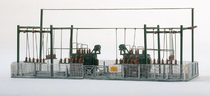 Das originalgetreue Modell des Umspannwerkes enthält zwei Transformatoren sowie Nachbildungen von Leitungs- und Netzschaltern. Der Bausatz ist mit weiteren Umspannwerken beliebig erweiterbar.