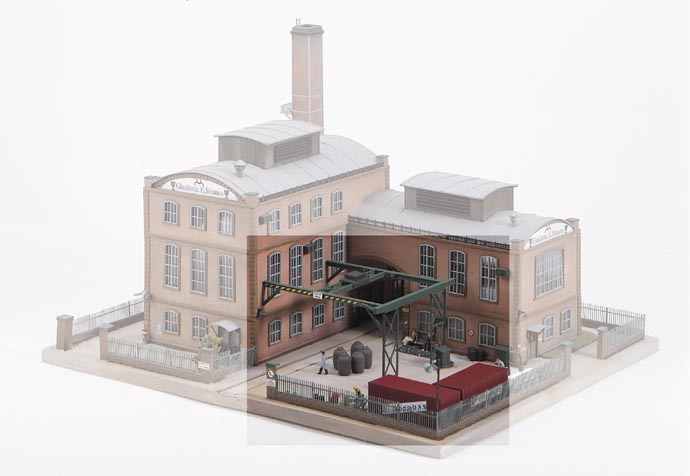 Das Fabrik-Zubehör enthällt Kompressoren, Fässer, Säuretöpfe, Container, Werkzeuge, usw. Ein Ladekran zur stationären Be- und Entladung von Güterwagen und Lkw's rundet diesen Zubehörsatz ab und verwandeln z.B. die Glashütte E. Strauss, #61116, in einen regen Fabrikkomplex.