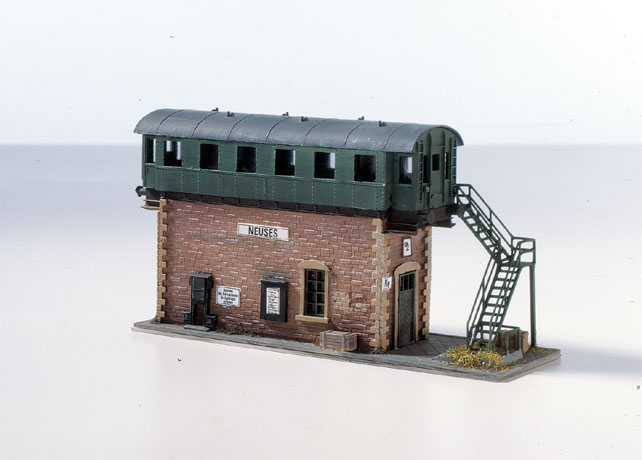 In vielen Bahnhöfen ist dieser Stellwerkstyp zu finden gewesen.Es handelt sich um einen alten Personenwagen, der ohne Räder auf ein Fundament gehievt wurde. Dadurch hatte er die nötige Höhe, um die Weichen zu beobachten und zu stellen. Der gealterte Bausatz wirkt durch die Farbgebung und die ungewöhnliche Bauart sehr interessant und ist eine sinnvolle Ergänzung jeder Anlage.