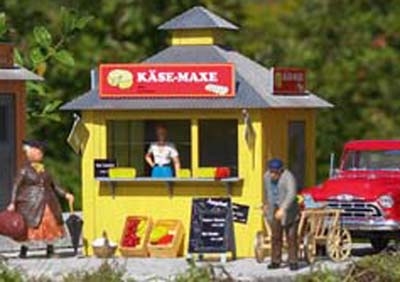 Auf dem wöchentlichen Markt gibt es eine Reihe kleiner stationärer Verkaufsstände, bei denen man alle möglichen Lebensmittel kaufen kann. Den besten Käse gibt's beim Käse Maxe. (Figuren und Käseimitationen liegen dem Bausatz nicht bei)