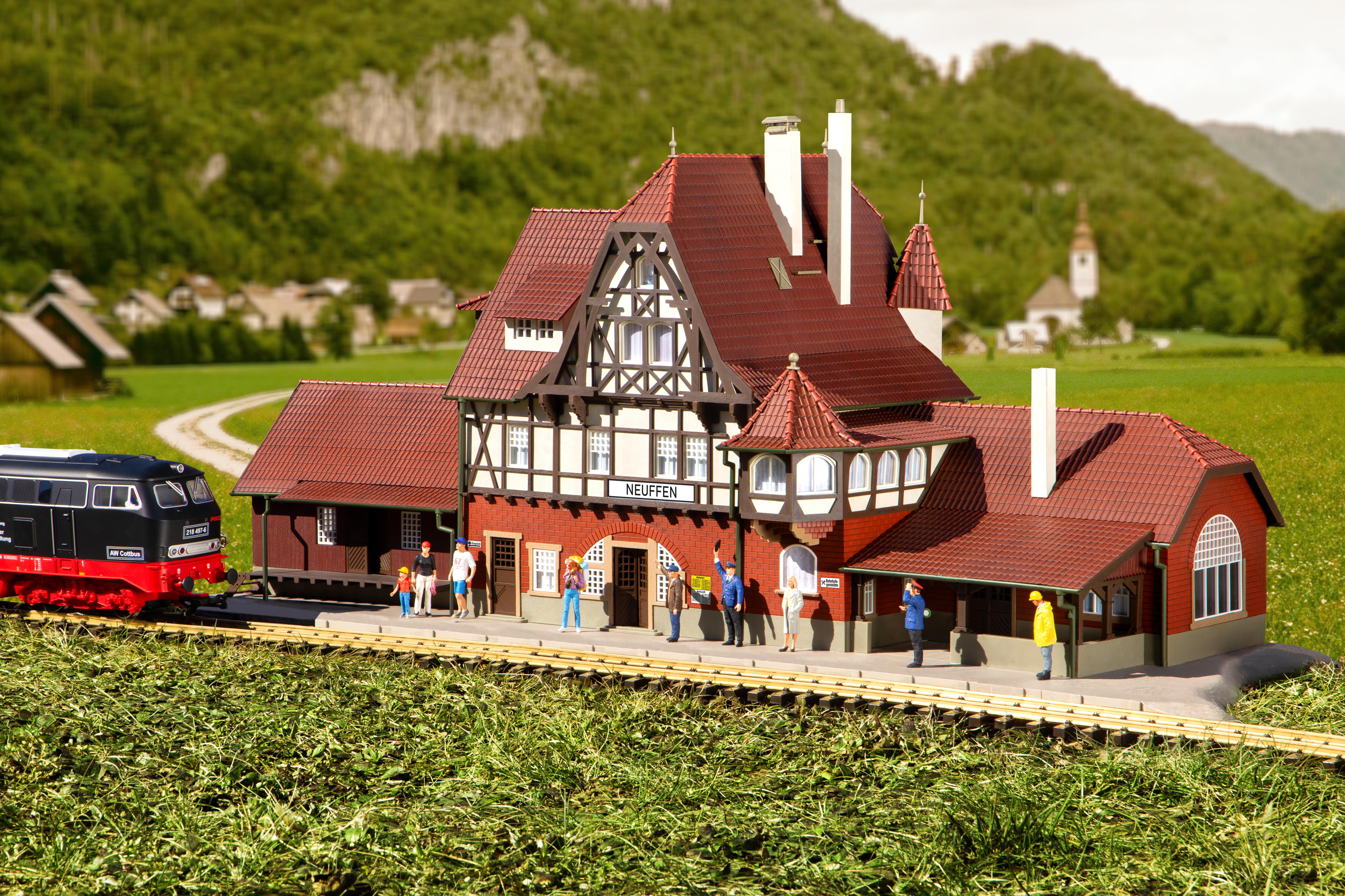 Das detailverliebte Modell lässt das markante Jugendstil-Gebäude aus der idyllischen Stadt Neuffen in Baden-Württemberg im Kleinen lebendig werden. Feine Fachwerknachbildungen, kleine Turmdächer und die prägnanten, grünen Dachrinnen verleihen ihm seinen unverwechselbaren Charme und bringen eine nostalgische Atmosphäre auf jede Gartenbahnanlage.
