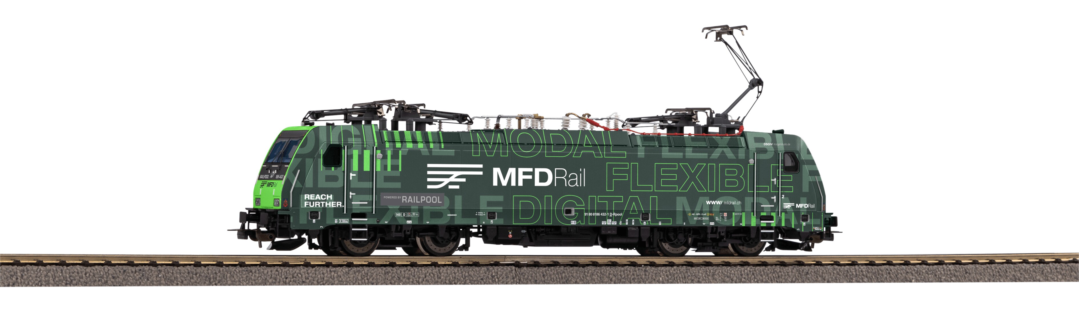 Die 186 432-1 erscheint in der attraktiven Beklebung des Schweizer Leasingunternehmens MFD Rail. Das Modell gibt die Proportionen des Vorbildes perfekt im Maßstab 1:87 wieder. Hierbei überzeugt es durch zahlreiche, separat angesetzte Teile. Der Dachbereich wartet mit einem aufgeräumten Dachgarten, feinen Isolatoren und feingliedrigen Stromabnehmern aus Metall auf. Die mit einem Decoder ausgestatteten Modelle verfügen über eine digital schaltbare Beleuchtung in den Führerständen, welche die detailliert ausgeführte Inneneinrichtung perfekt in Szene setzt. Mittels der Digitalschnittstelle nach NEM652 lassen sich die Funktionen auch im Handumdrehen bei analogen Modellen nachrüsten.
