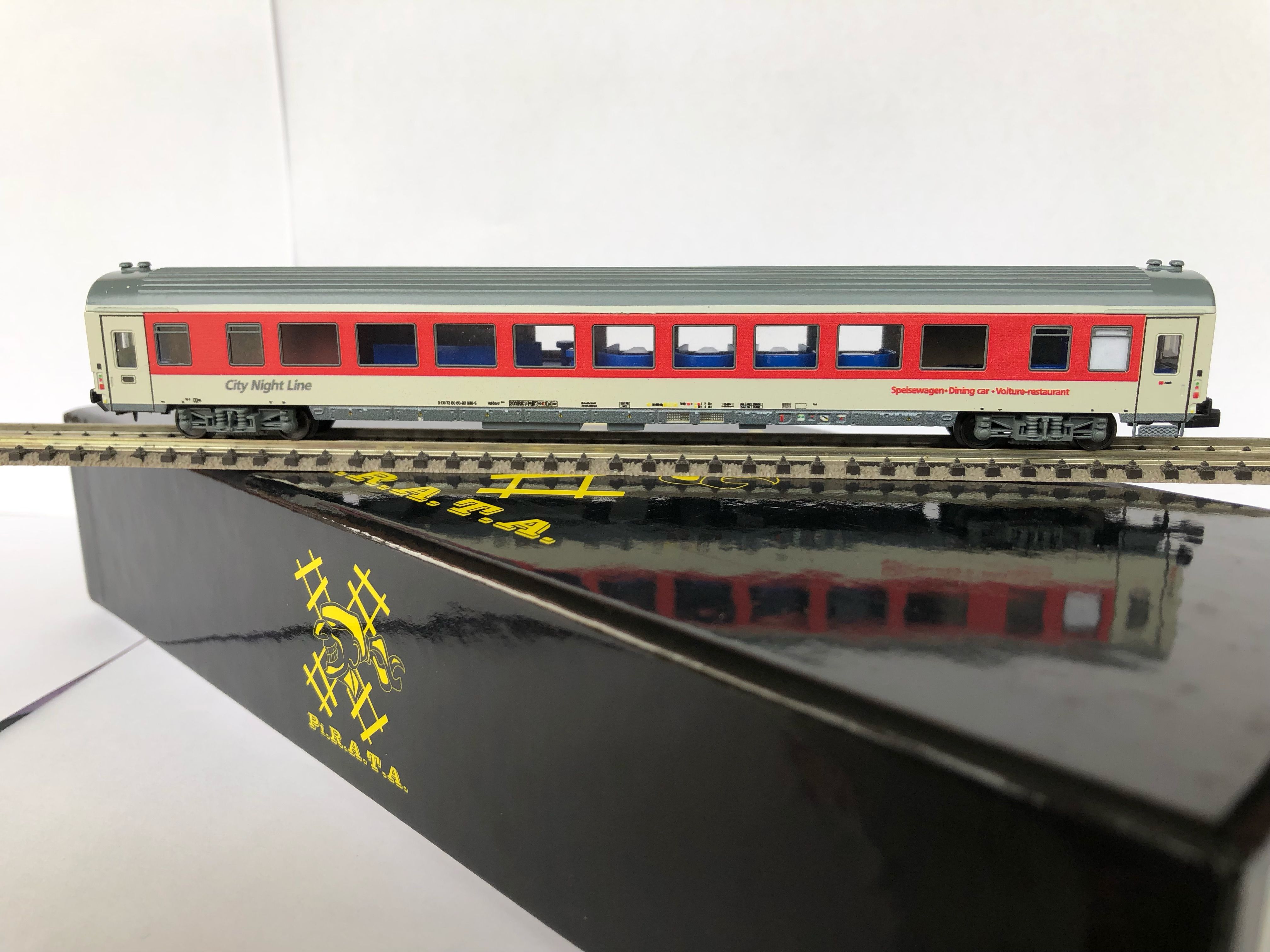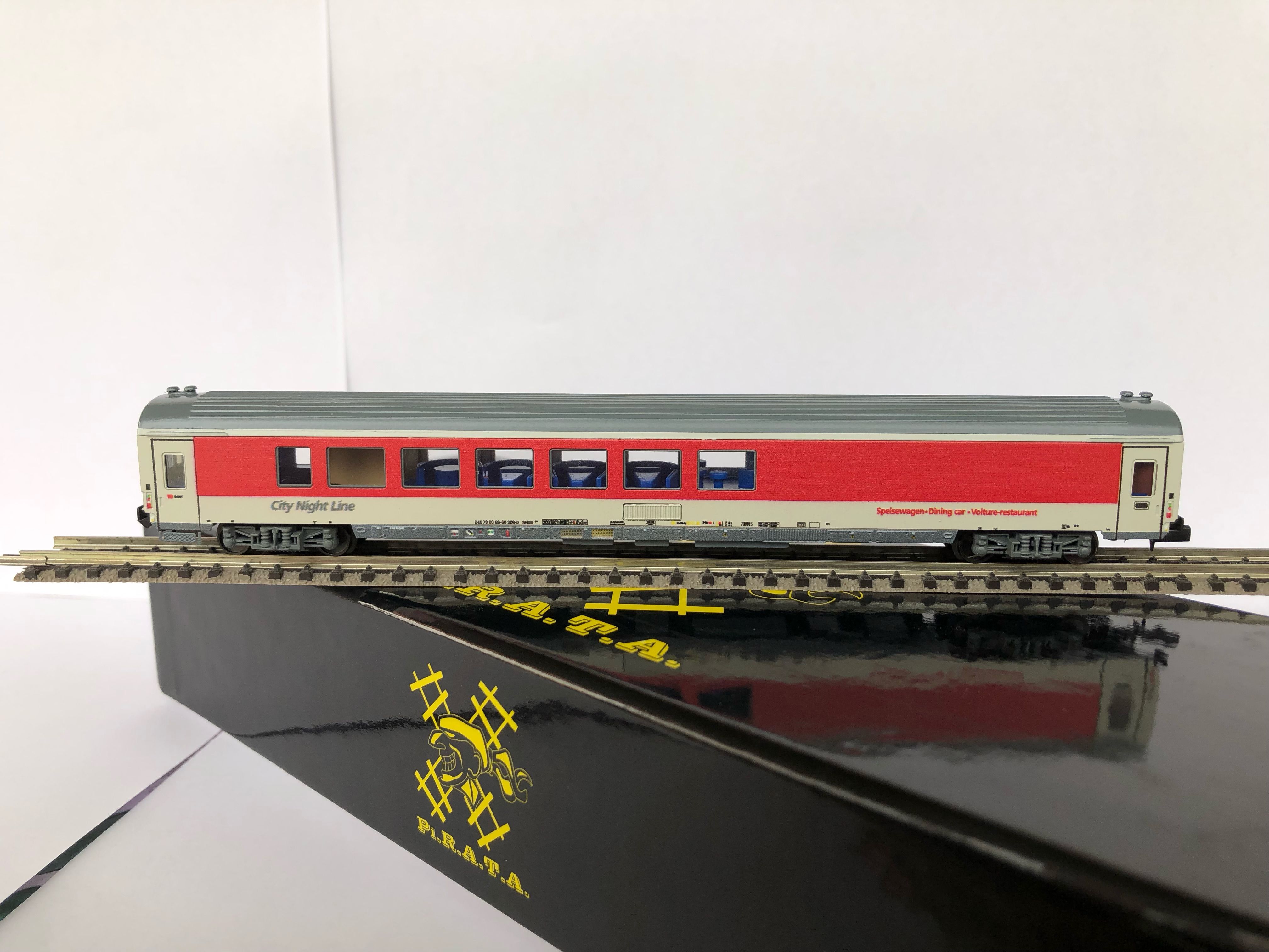 Exklusivmodell für Menzels Lokschuppen. Speisewagen der Bauart WRkmz 858.0 der CityNightLine in weiß/roter Farbgebung für die Epoche 6.