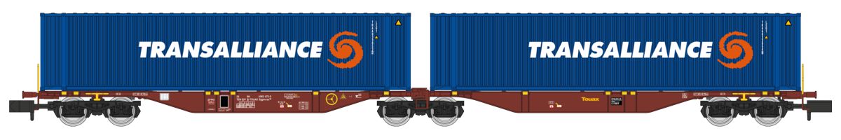 Doppelcontainerwagen Bauart Sggmrss 90 der TOUAX mit 2 x 45' TRANSALLIANCE Container für die Epoche 6