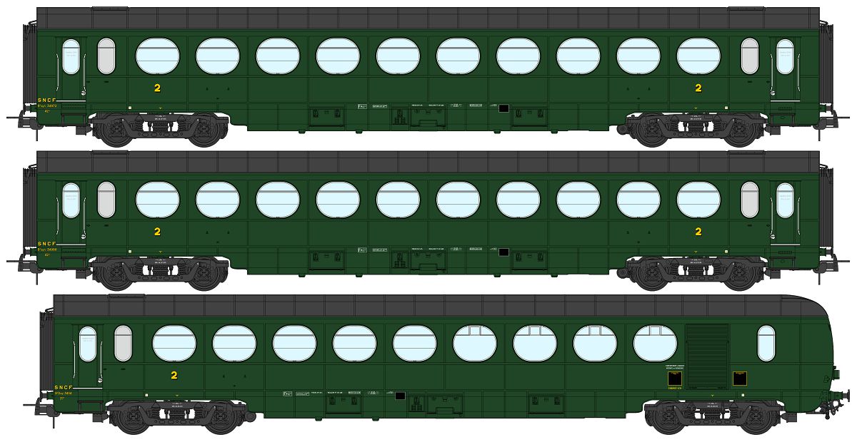 Set mit 3 Leichtwagen STATE B10 Nr. 34972, B10 Nr. 34988 und B5d Nr. 34114, grün 306, SNCF Ep.III B
