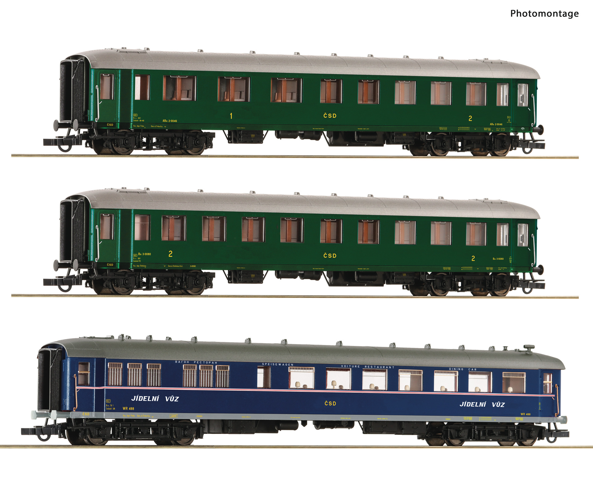 Wagenset 1 mit drei Schnellzugwagen der Tschechoslowakischen Staatsbahnen. Bestehend aus einem Schnellzugwagen 1./2. Klasse, Gattung ABa, einem Schnellzugwagen 2. Klasse, Gattung Ba und einem Speisewagen, Gattung WR. - Fein detaillierte Modelle mit extra angesetzten Steckteilen - Mit vorbildgerechter Inneneinrichtung