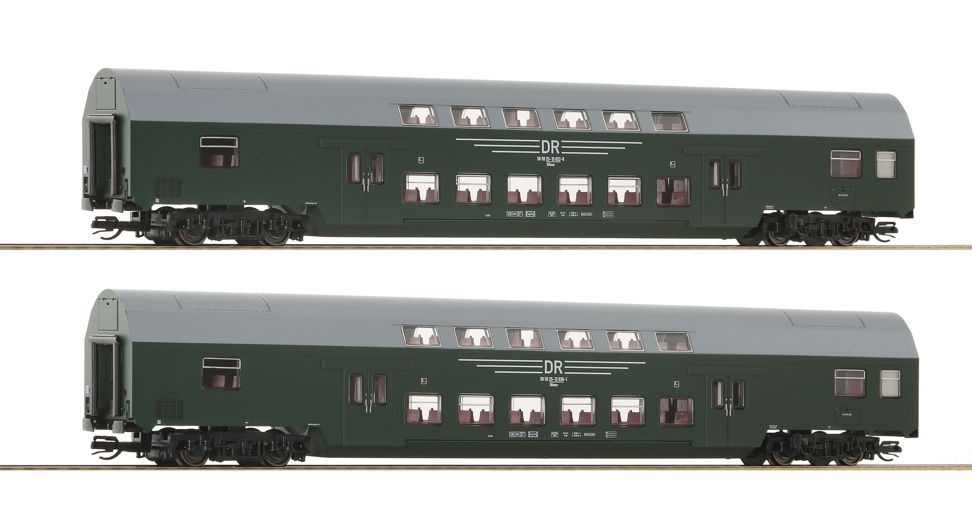 Wagenset 2 mit zwei Doppelstockwagen, Gattung DBmue, der Deutschen Reichsbahn.