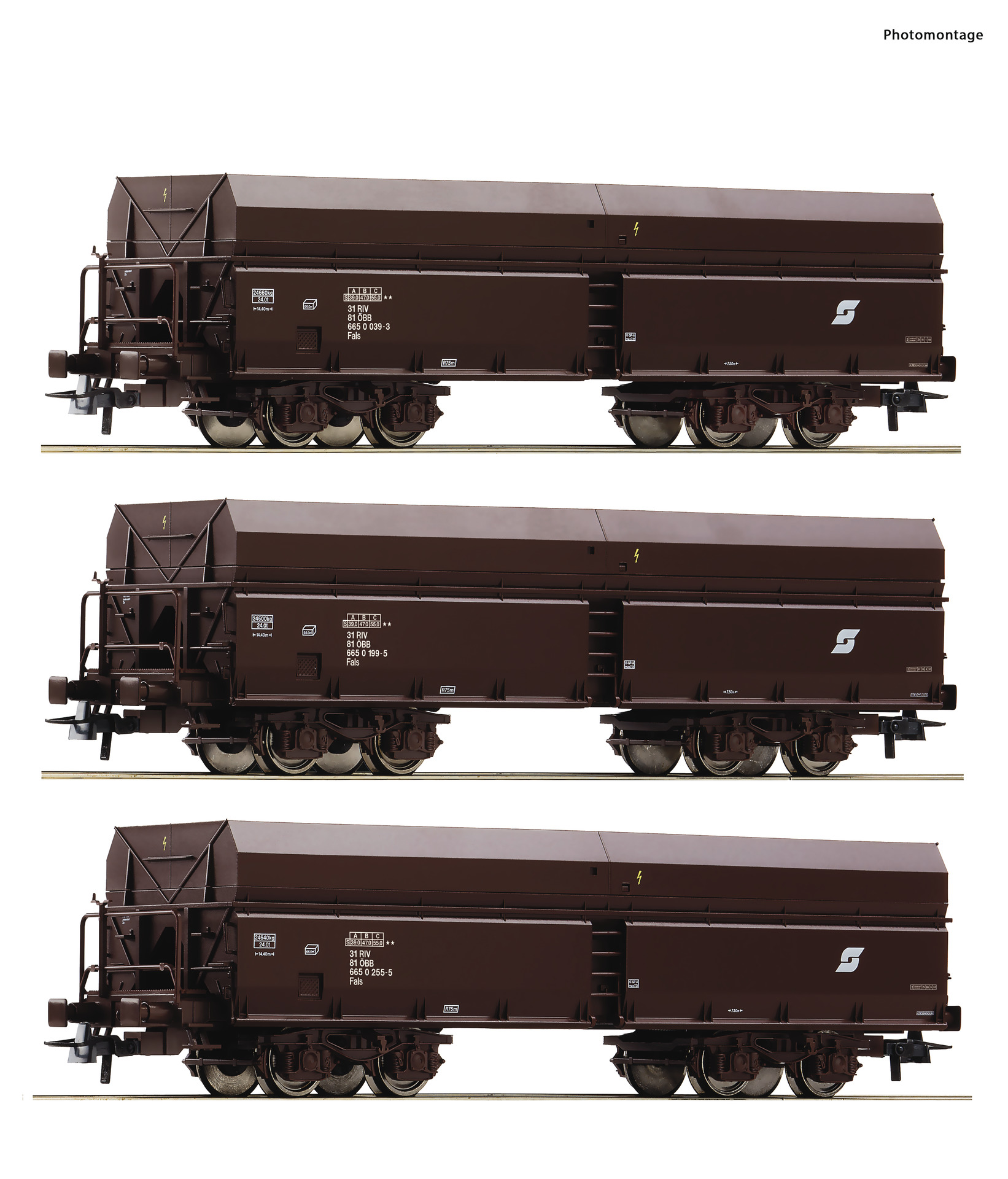 Wagenset mit drei Selbstentladewagen, Gattung Fals, der Österreichischen Bundesbahnen. - Alle Wagen mit unterschiedlichen Betriebsnummern - Ganzzug geeignet