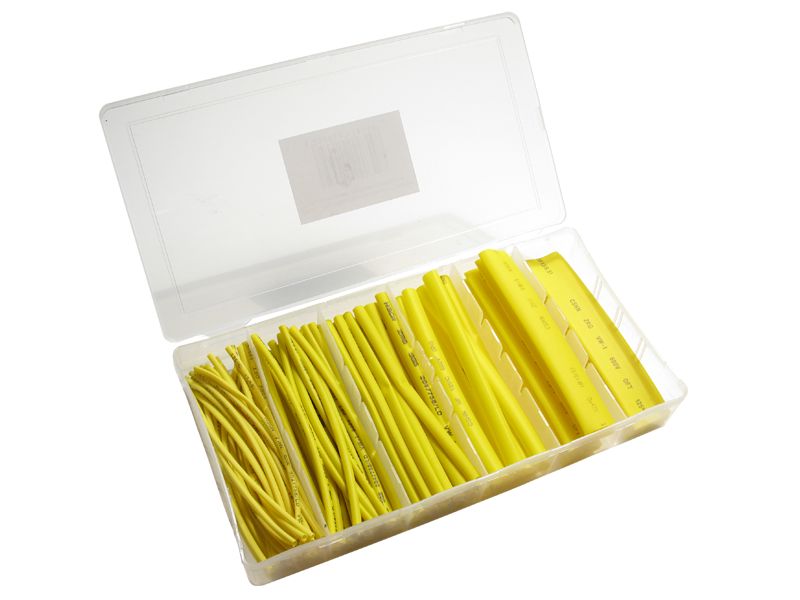 Schrumpfschlauch Sortiment Set 100 Teile 10cm gelb - Top ausgerüstet zum Top Preis! Dieses Sortiment sollte in keiner Werkstatt fehlen!Die dünnwandigen und flexiblen Schrumpfschläuche in der Farbe gelb sind in 10cm lange Stücke vorgeschnitten und werden in einer übersichtlichen Box geliefert.