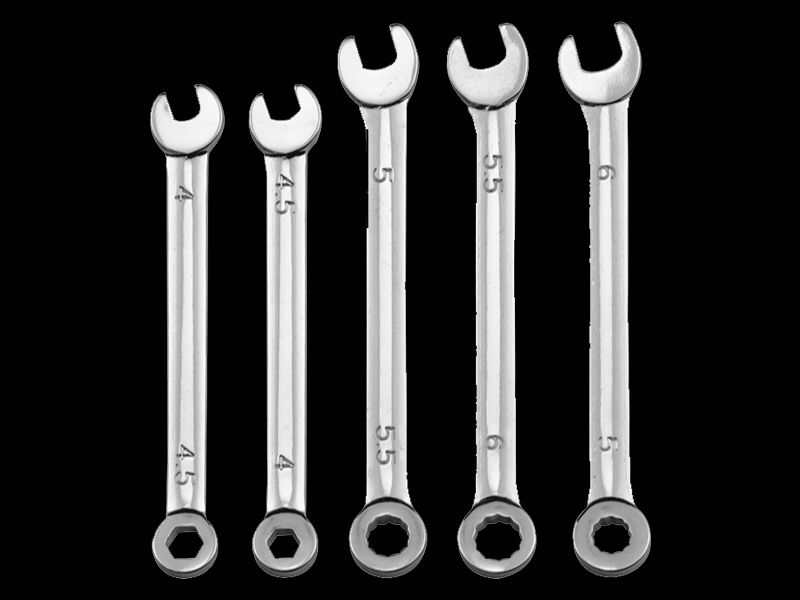 Mini Steckschlüssel Ring-Maulschlüssel Set 4mm bis 6mm 5-tlg. - 5-teiliges Ringmaulschlüssel-Set in sehr kleinen Schlüsselweiten.Schlüsselweiten - 4,0 / 4,5 / 5,0 / 5,5 / 6,0 mm.Jede Größe als Ring- und als Maulöffnung enthalten.
