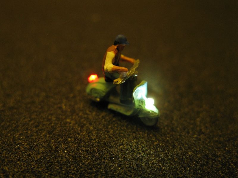 Motorroller Roller mit LED Beleuchtung N - männlich - Sie erhalten einen winzigen beleuchteten Rollerfahrer mit einer Fahrerfigur (Figur männlich). Das Modell ist ausgestattet mit einer warmweißen Frontlicht- und einer roten Rücklicht LED der Bauform 0402.Die Beleuchtung wurde sauber verarbeitet und die Verkabelung der Leuchtdioden ist dezent in das Modell eingearbeitet und somit kaum sichtbar.